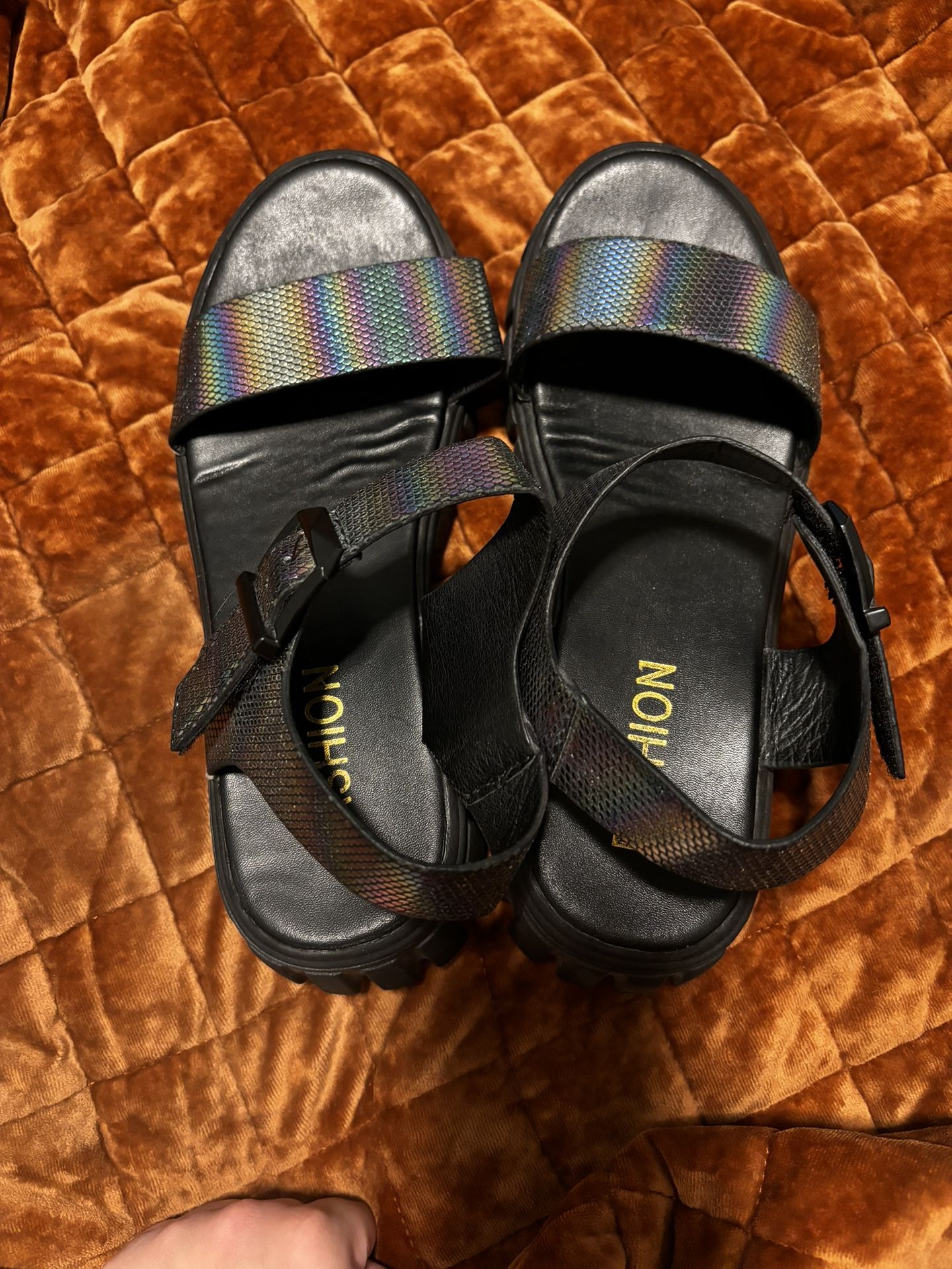 Platform style sandals. Only worn a few times. They are muti-colored and black. Velcro strap. Euro size 39(us size 8.5W)