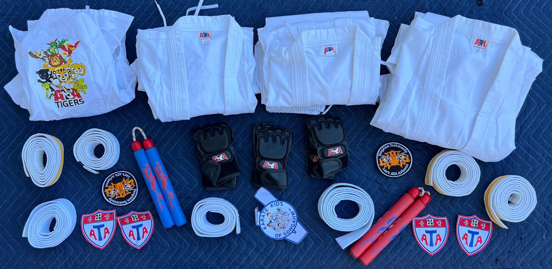 Hand protector 3 Youth S/M - fits small to adult size too. 4 ATA uniforms Size 6 (adult) Size 5 (adult) Size 2 (youth) Size 00 (toddler) And all the rest of the accessories you see.