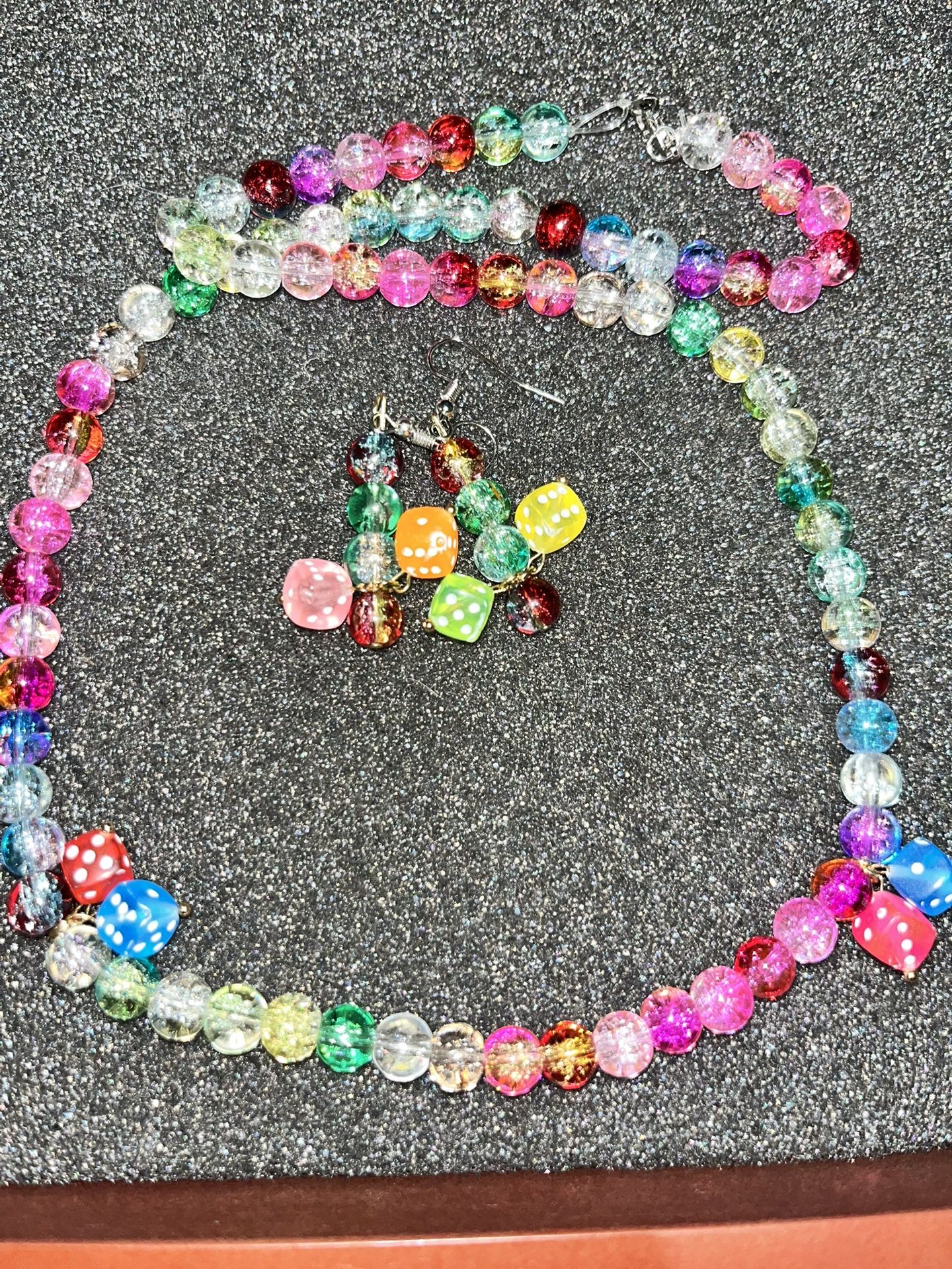 I have a necklace and earring set made of glass beads the dice are plastic.