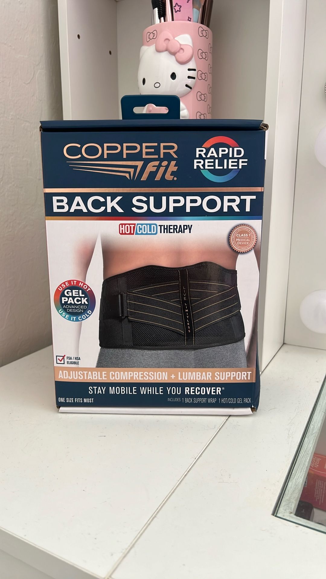 Back support belt with gel pack that I have in my freezer right now because at the time when I bought this it was for my back it was in pain while I was at work and I tried using the ice pack with the belt but personally it didn’t really help me but it can be warmed or not used with the belt.