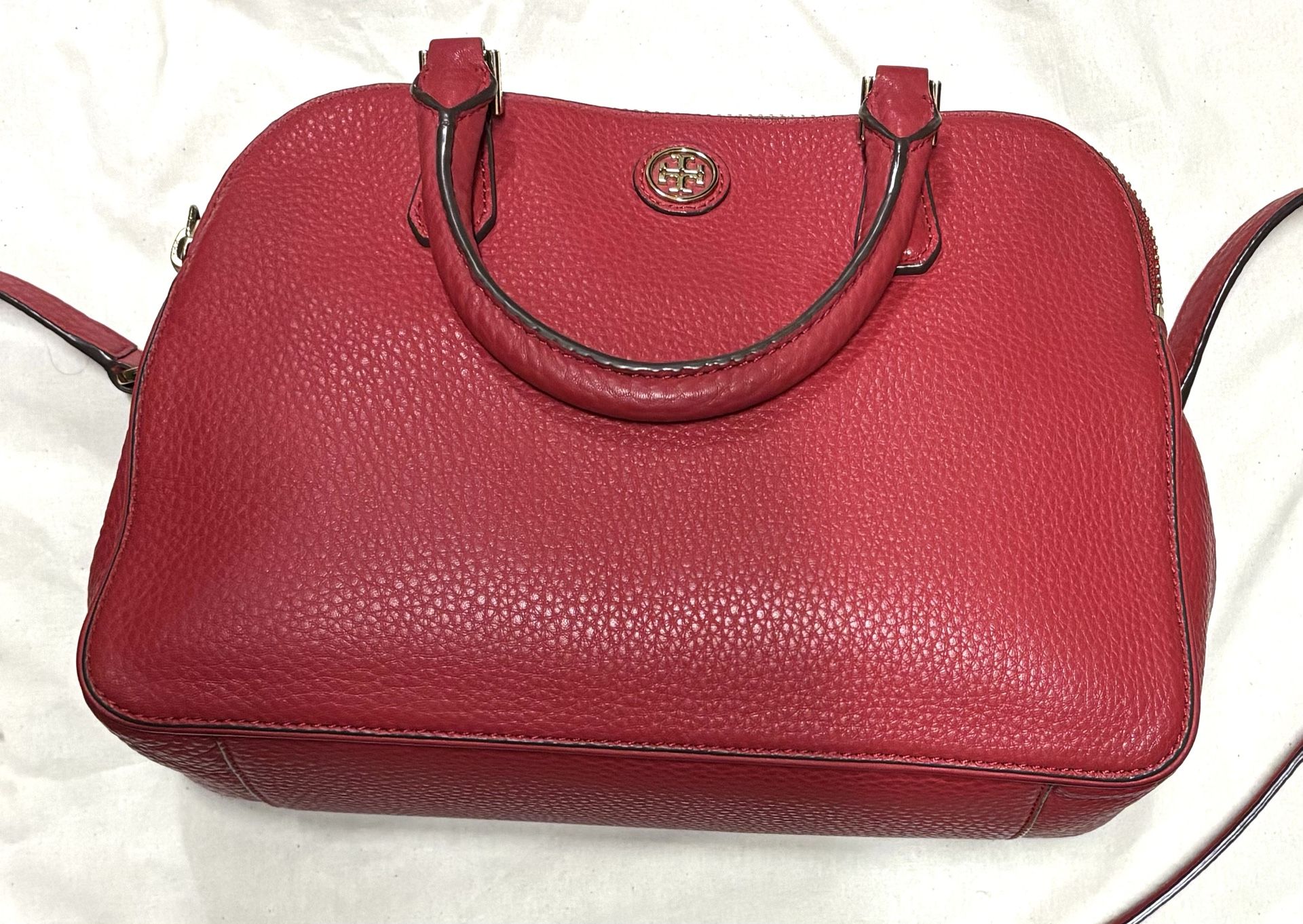 Tory Burch grained leather handbag in like new condition. Beautiful red color and very clean. Can be worn as crossbody or a satchel. It has no stains, scratches or marks inside or outside. Measures 11 1/2” wide x 8” tall x 4 1/2” deep. It is a very organized bag with 3 compartments- 2 zipped and one with magnetic closure. The center compartment has a zipped pocket and slots. Bag comes with 1 long strap for crossbody. It has a small Tory Burch logo in the front. Dust bag is included. Reasonably priced for $150. Sale will be final. From a non smoking home.