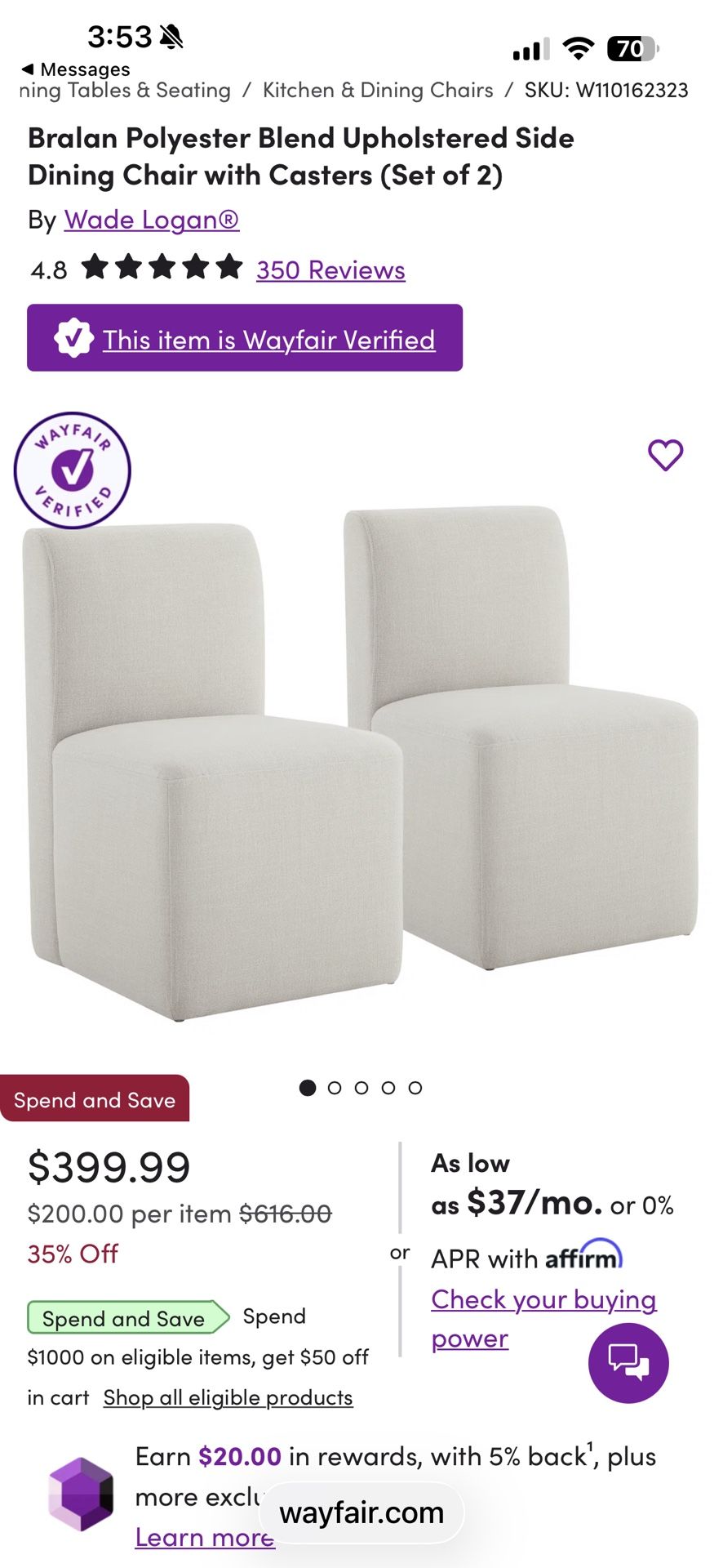 Wayfair 2 Pack Linen Chairs unopened. Retail price is $399. Must go. https://offerup.com/redirect/?o=aHR0cHM6Ly93d3cud2F5ZmFpci5jb20vZnVybml0dXJlL3BkcC93YWRlLWxvZ2FuLWJyYWxhbi1wb2x5ZXN0ZXItYmxlbmQtdXBob2xzdGVyZWQtc2lkZS1kaW5pbmctY2hhaXItd2l0aC1jYXN0ZXJzLXcxMTAxNjIzMjMuaHRtbD9waWlkPTkzNDUxMzQ4NQ==