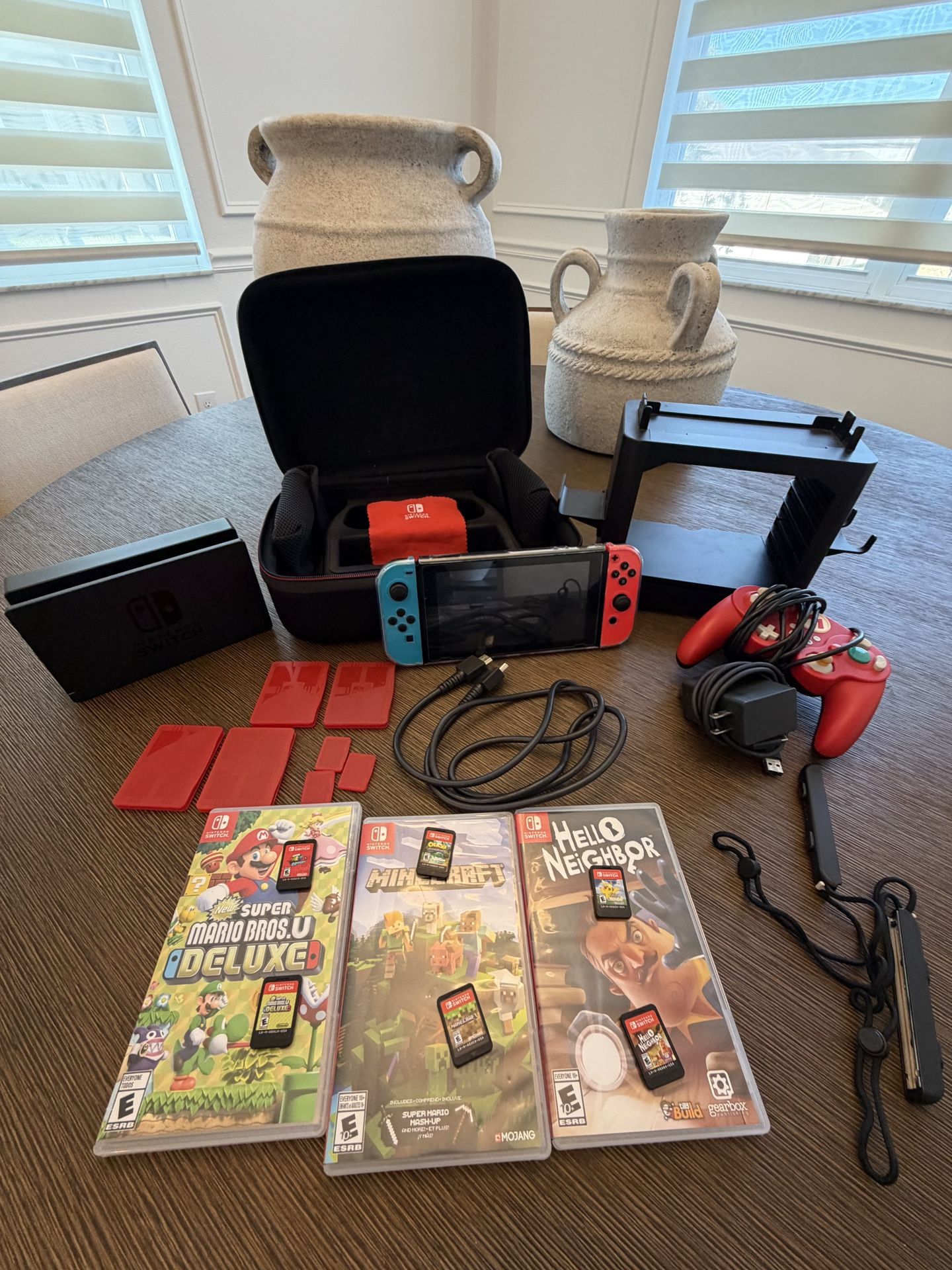 Used but works like a charm.This offer comes with the Nintendo one, the large case,game holders, SIM card holder, 6 games( 3 without case, one doesn’t work which is Mario odyssey), additional Mario controller, charger, charger box to connect to tv, HDMI cord, Nintendo dust cleaner, Nintendo protective case, controller protective case, and 2 compartment holders in case. Looking for 300 dollars but negotiable.