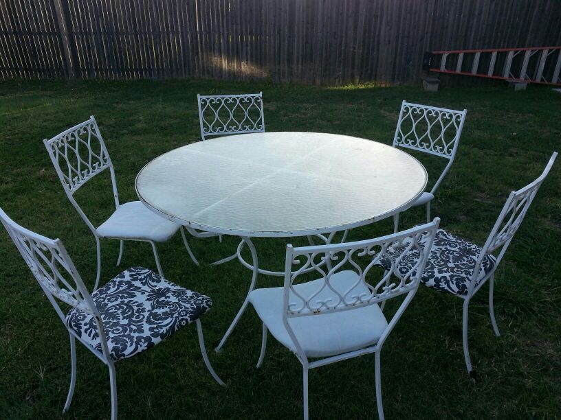 Antique white cast Iron table with 8 matching chairs