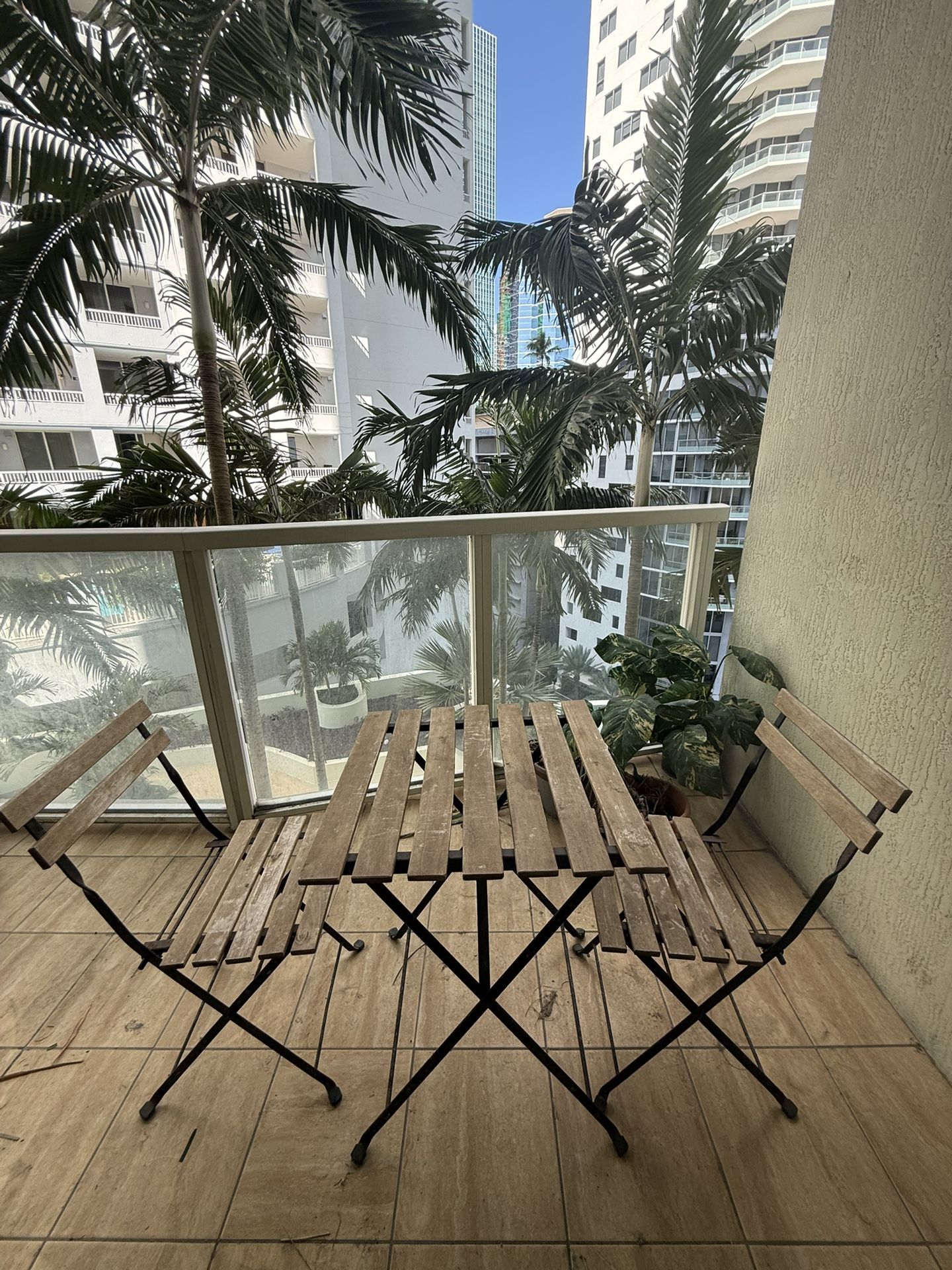 Small outdoor bistro set with a light brown wooden finish. Includes table and two chairs. Great for balconies, patios, or small outdoor spaces. Good condition, sturdy, and weather-friendly. Pickup only.