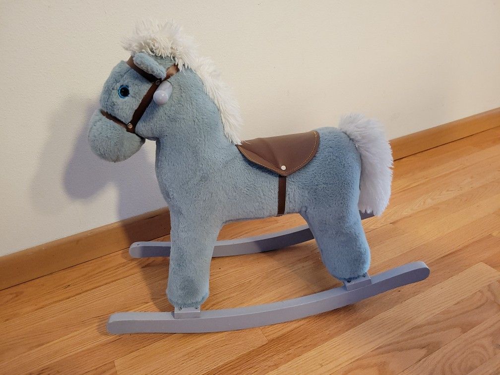 Rocking horse is in good condition. Ideal size for a kid around 2 to 5. Sqeeze the ear to hear galloping sound. Comes from smoke free and and pet free house.
