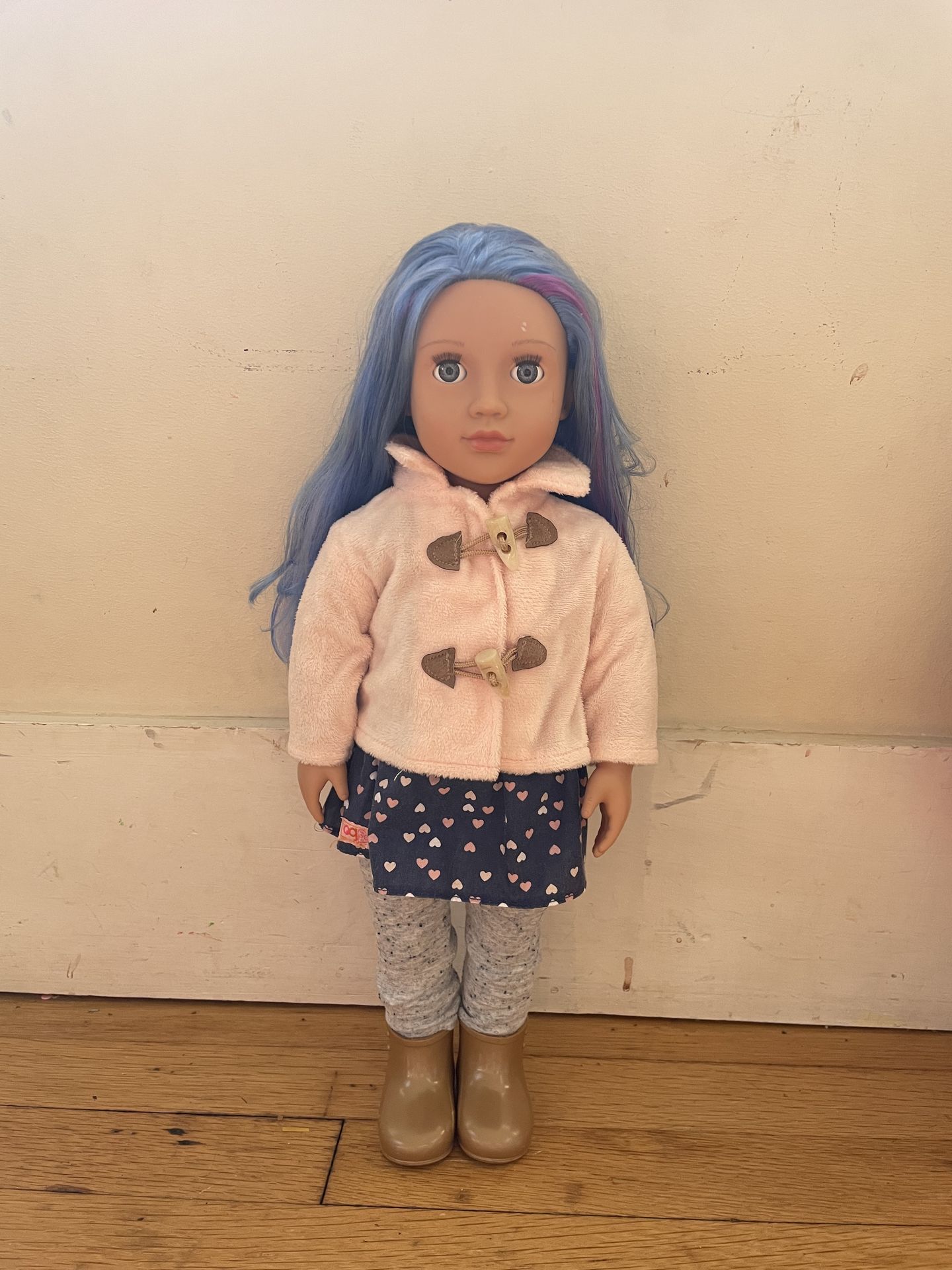 Blue, purple, pink hair; cute animal hat, pink jacket with fun buttons, heart dress, gray pants, and golden boots