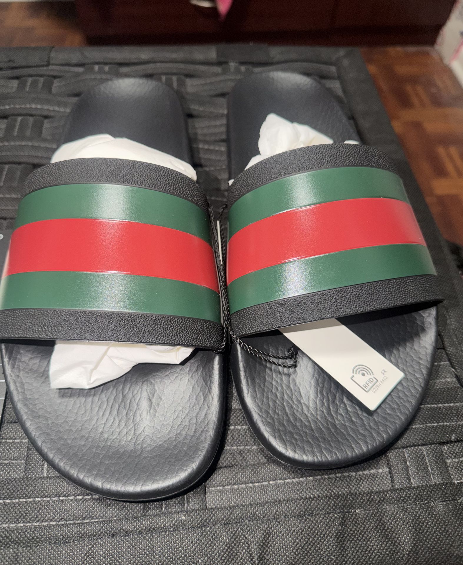 Gucci slides size 11. Christmas gift from years ago. My foot is too wide. They’ve been sitting in my closet for 2-3years box is a lil dusty and lil dirty.