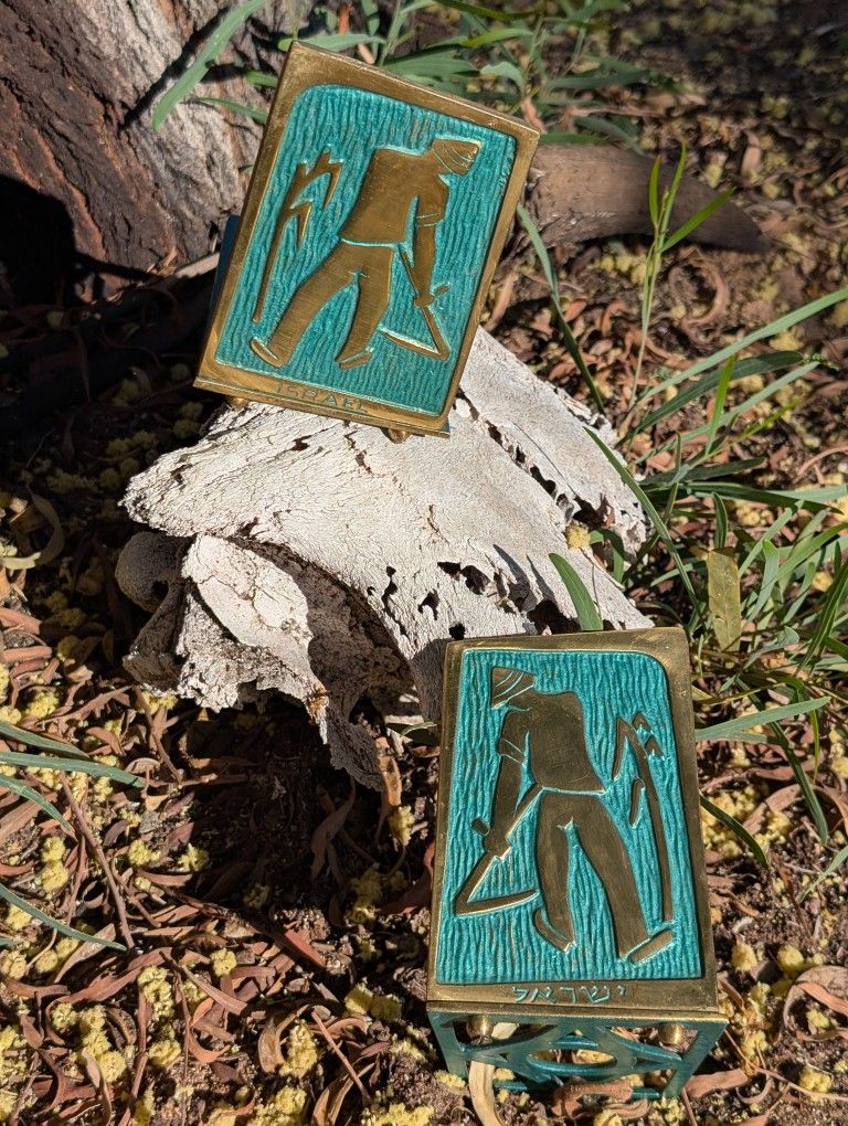 Add a touch of elegant history to your bookshelf with this striking pair of Israeli brass bookends, measuring approximately 5″ tall × 3¼″ wide × 4″ deep (base depth), and weighing roughly 1 lb 4 oz for the pair. Each bookend features a richly patinated brass relief of a figure harvesting grain—an evocative motif in mid-century Israeli decorative art, celebrating the land, its labour, and harvest. In Jewish tradition, the land’s produce—particularly wheat and barley—is deeply symbolic: for example, one source notes that wheat “represents … the foundation of human existence, the bread of life, and kindness (chesed). Moreover, agricultural imagery in early Israeli art was often used to express the Zionist ideal of land renewal and connection to the soil. On the front of each bookend is a bold stamped mark reading “Israel”, and one includes the same in Hebrew. On the reverse, both pieces bear the embossing “MS/02 NIR-CHEN ISRAEL”—offering clear provenance and mid-century maker-mark authenticity. On the front of each bookend is a bold stamped mark reading “Israel”, and one includes the same in Hebrew. On the reverse, piece bears stamp of “MS/02 NIR-CHEN ISRAEL”—offering clear provenance and mid-century maker-mark authenticity. The vivid green enamel provides a beautiful contrast with the warm brass tones and patina, adding rich colour and texture to the pieces’ sculptural quality. These bookends combine functionality with decorative narrative—ideal for lovers of Judaica, mid-century décor, or unique collectible accents. Please review all photos carefully. If you have any questions, I’m happy to help. Also feel free to browse my other listings for similar mid-century pieces. Thank you for looking, and happy collecting!