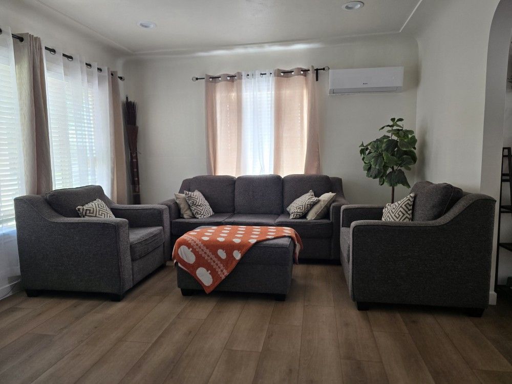 Four piece set includes 1 sofa, 2 chairs and 1 ottoman for flexible seating arrangements. Upholstered in 100% polyester fabric that stands up to everyday use in high-traffic living rooms. Tapered wood legs provide stable support and a compact footprint for smaller rooms. $350 or best offer