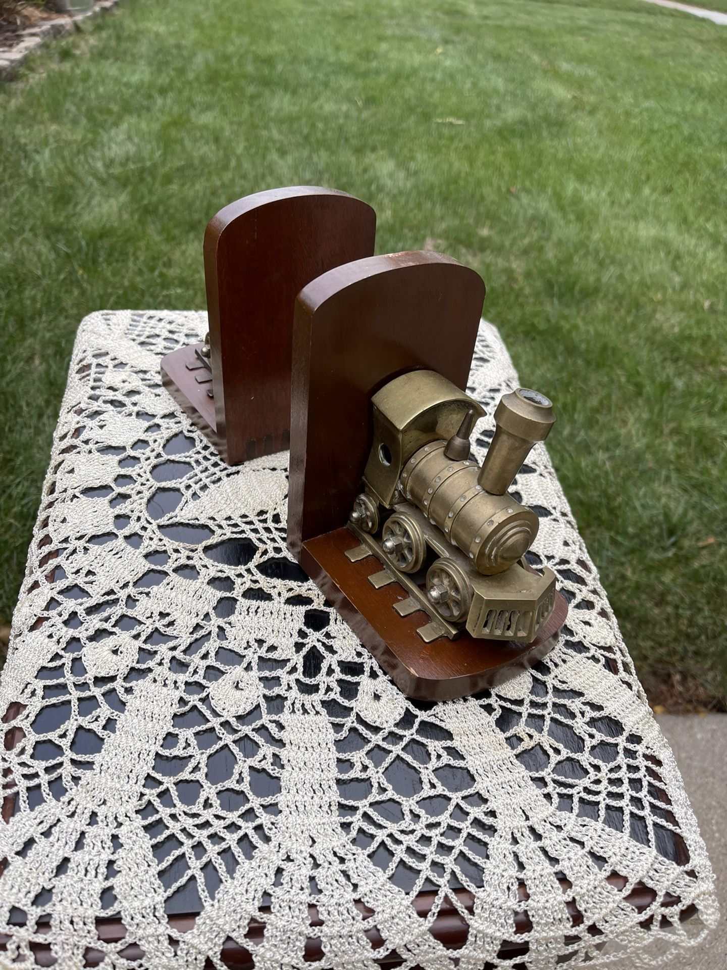 Vintage Enesco Brass Train Locomotive Wood Book Ends Will deliver for a small fee.