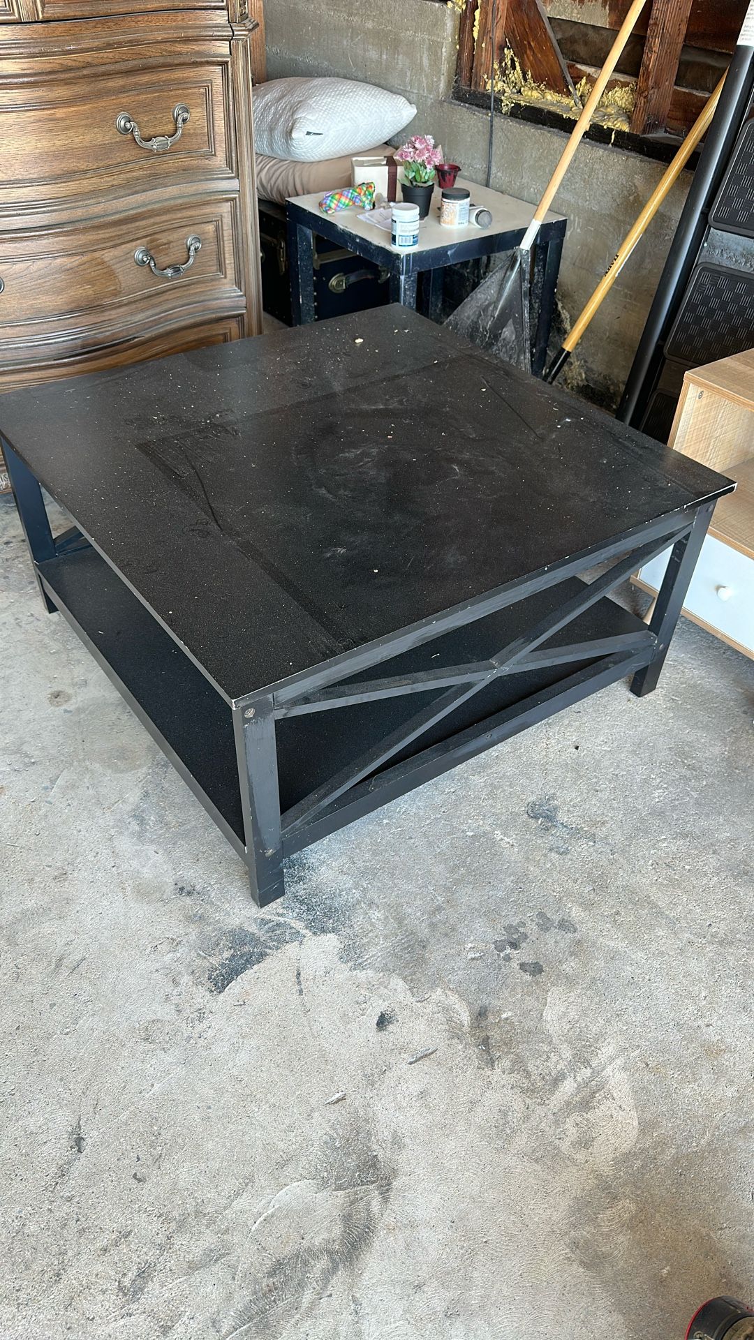 Wayfair Coffee table, small defects but can be fixed with some black paint. Needs to be wiped down. About 3x3 feet. Pick up only