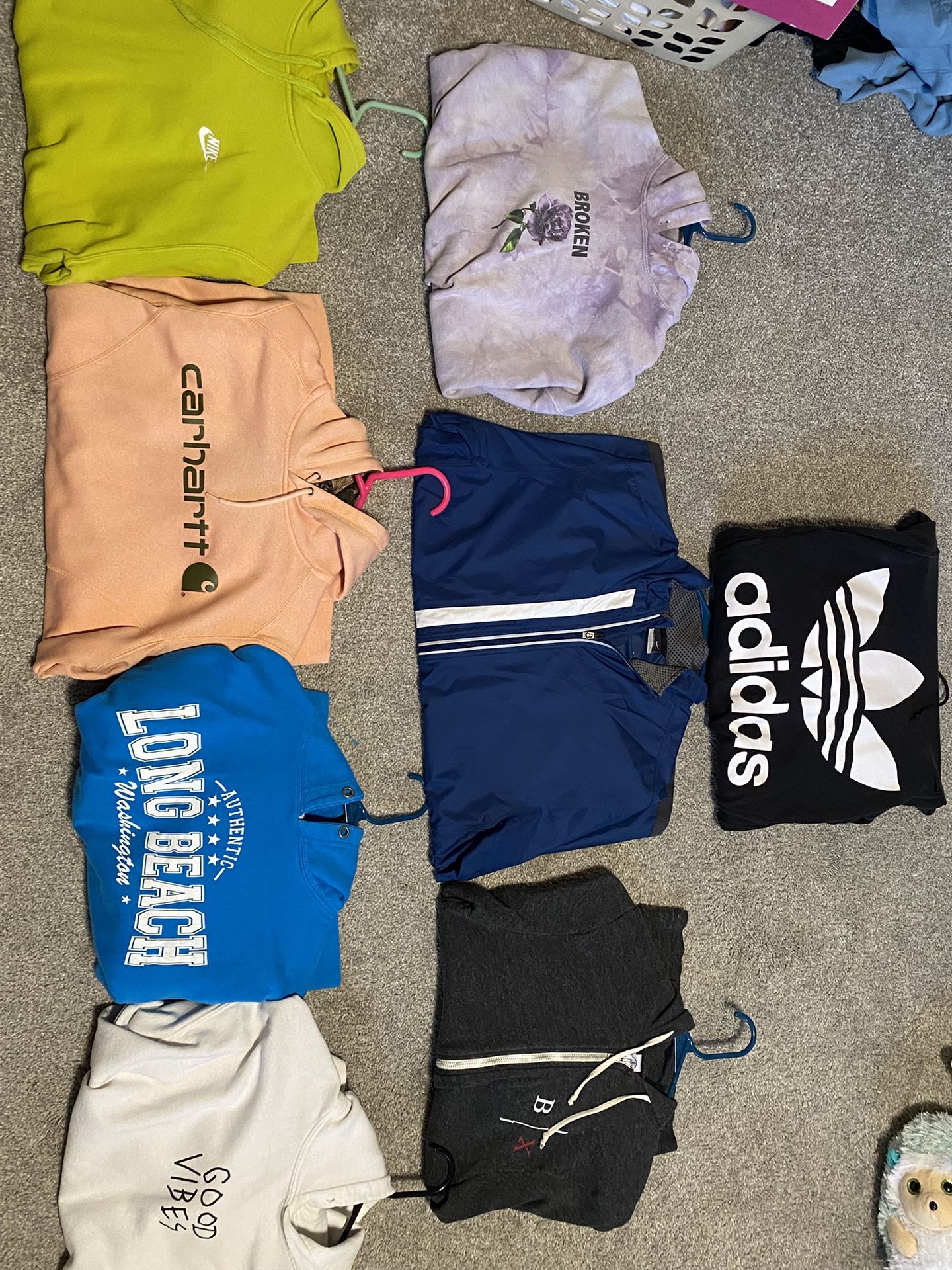 All size Small or Medium except the adidas hoodie but it fits like a Small. $40 MUST TAKE ALL Adidas (XS) - $10 Broken Promises (Medium) - $10 Nike ClimaFit (Medium) - $10 B/X Zip Up (Small) - $5 Nike Hoodie (Medium) - $15 Carhartt (Medium) - $5 Long Beach Washington (Medium) $10 Good Vibes (Medium) - $5