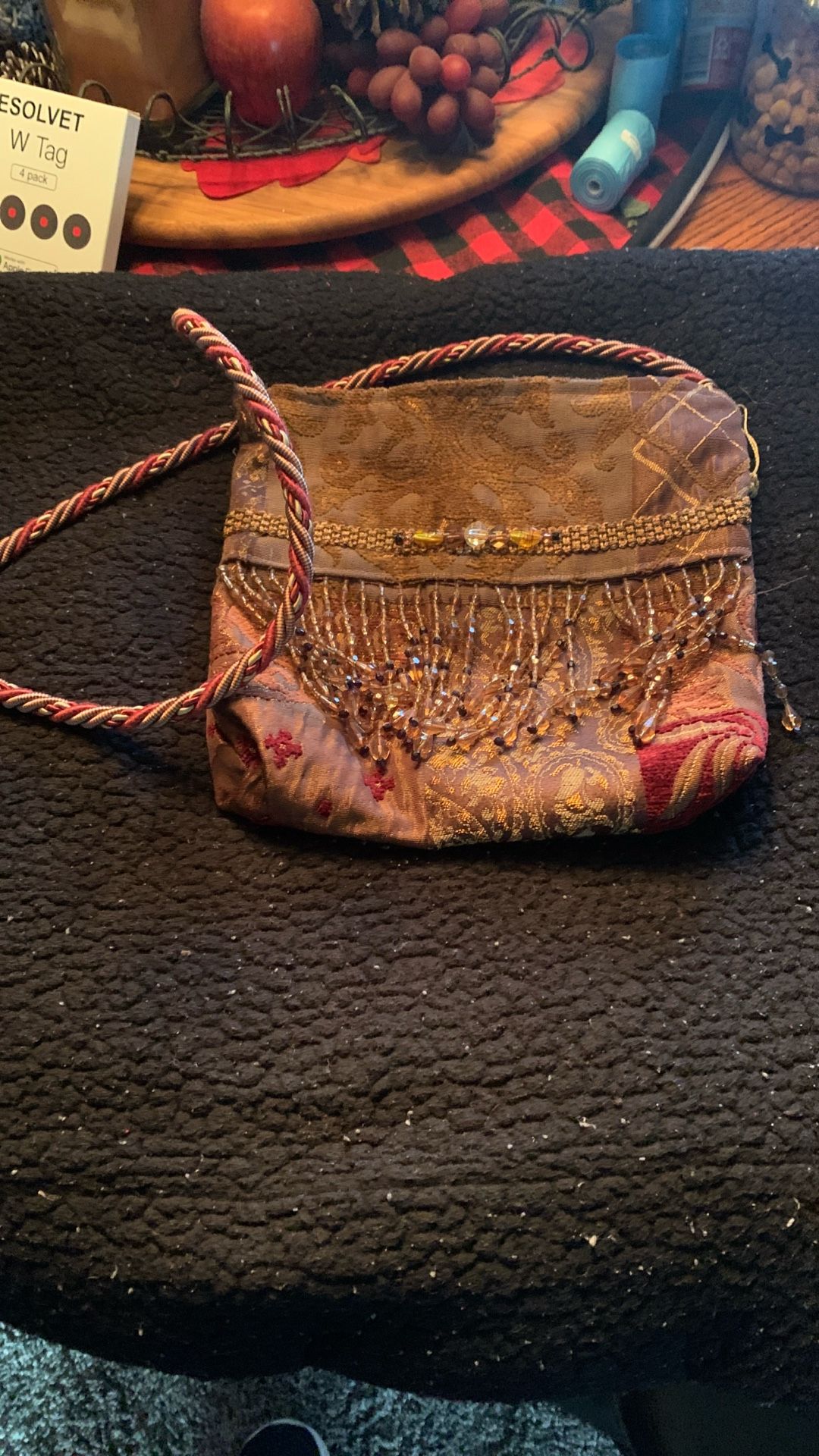 9.5” x 9.5 “x 2” Zipper close 17 inch hang Beaded with tassel Never used