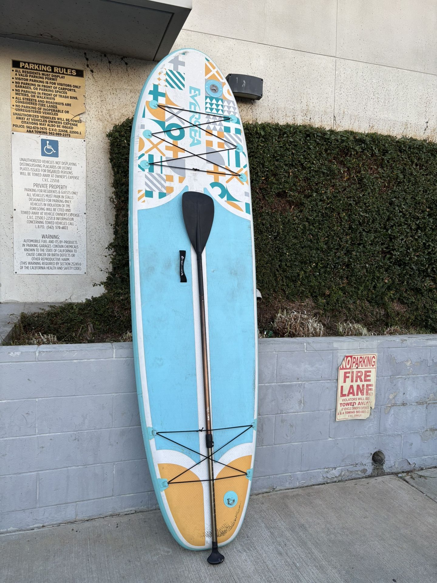 Comes with the paddle. Good shape. No chunks missing. Bright colors. Has the safety/cargo strings. Very light weight. One person can carry it by the handle. Cash only. No deliveries.