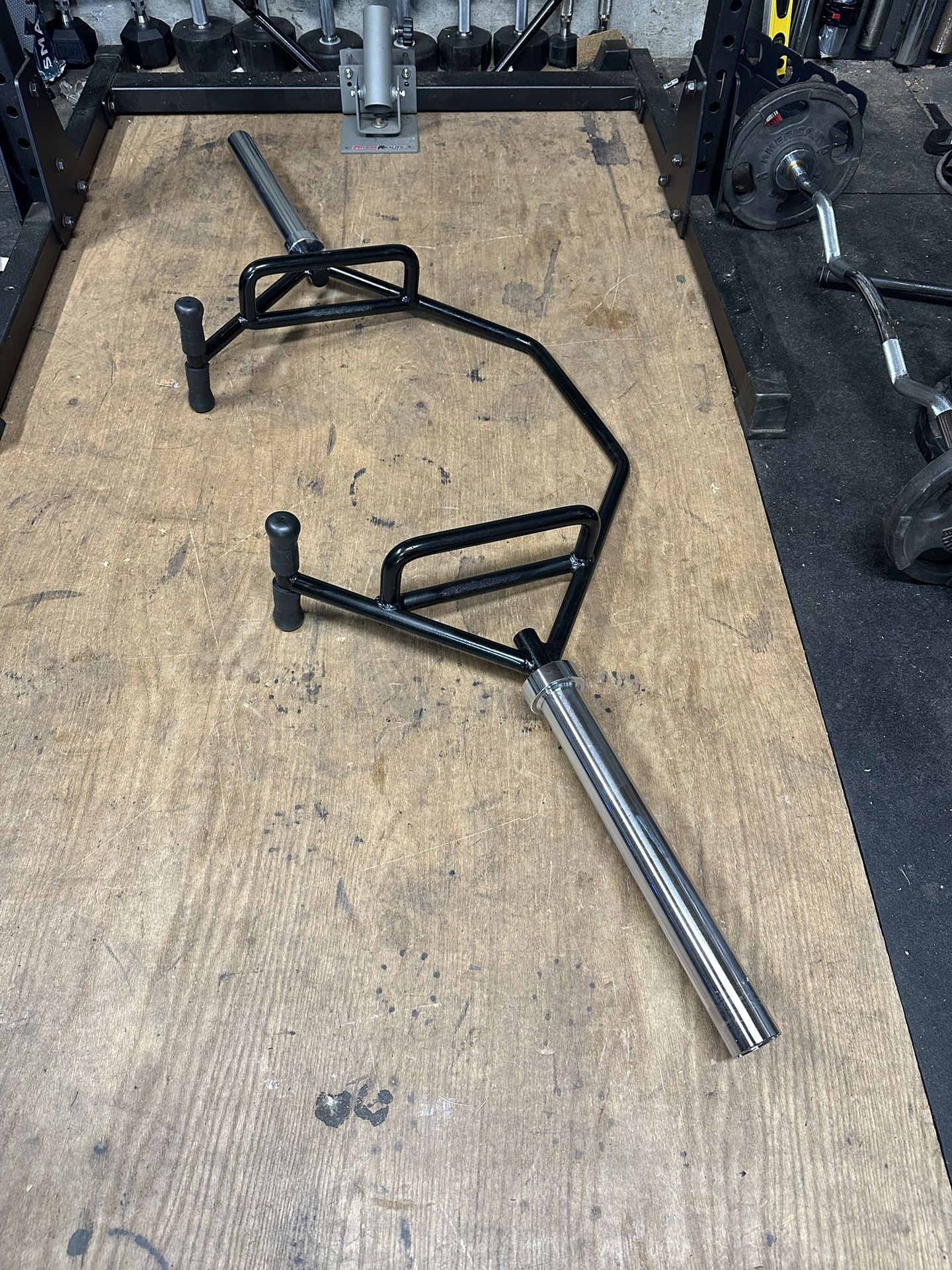 Open Olympic deadlift trap bar with neutral and raised grips. Can stand on the side for easy weight loading.