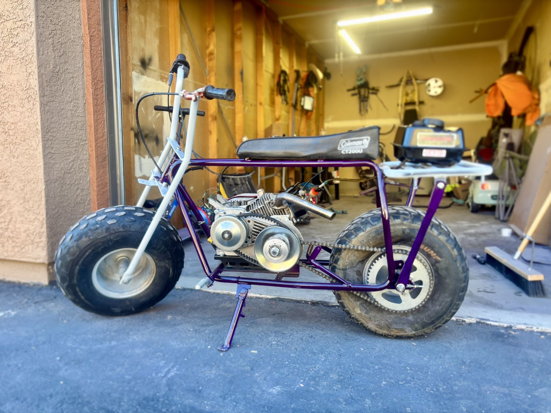 Custom CT200U brakes need to be adjusted. New brake pads included when I sell the bike. Just installed new fuel lines, fuel filter and air filter. Pictures with the cylinder tank are most up to date ones, to show fuel lines and filters. • Anodized Purple frame w/ Power white pearl accents • Crank starter • Cylinder gas tank • Torque converter, brings the front wheel up easily if you really want it to • 45 chain on a 224cc built engine • Aluminum flywheel • Oil sensor delete • Gov delete • Upgraded card and intake • I’m 320lbs and this will hit 55-60 with me on it, I don’t doubt it can go quicker with someone lighter. Asking 550 obo and I can deliver aswell