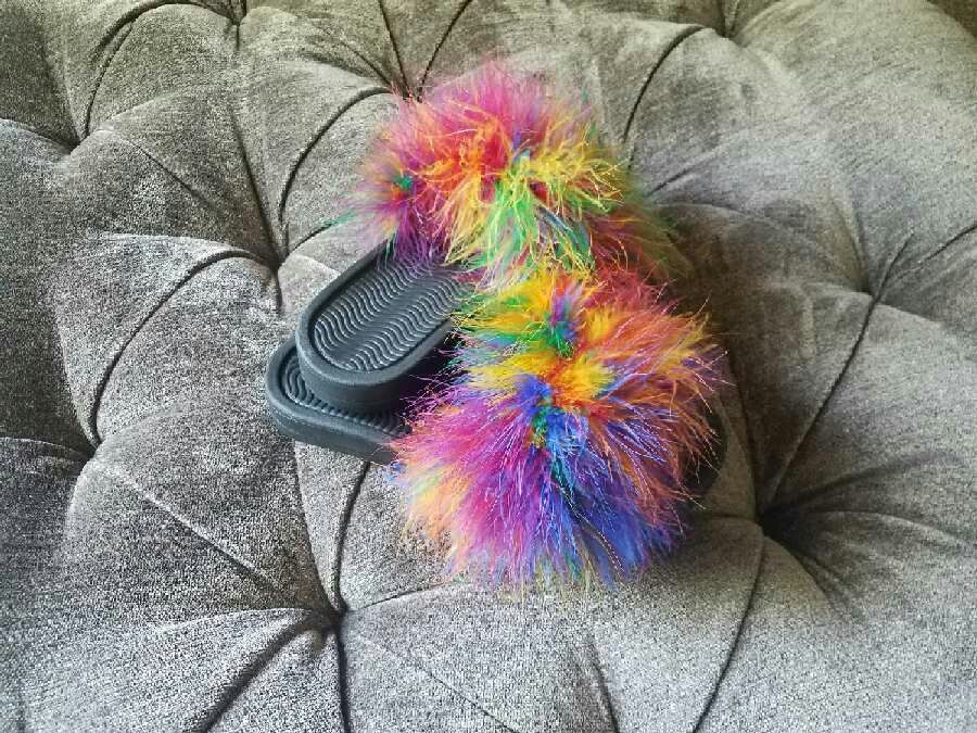 New rainbow fuzzy slides. Size 5/6 and made to order in other sizes