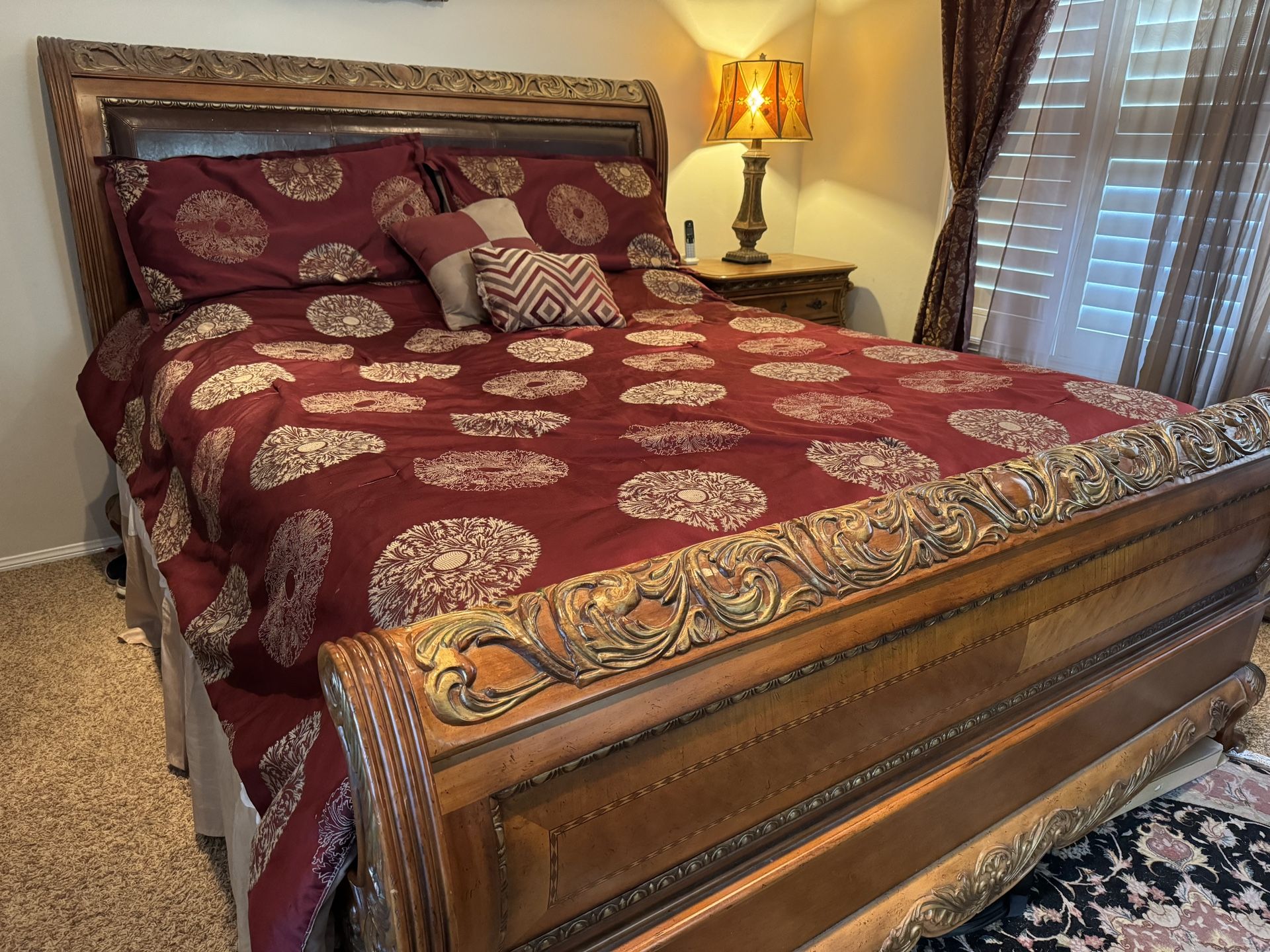 Bed, Lamp, Mirror, Nightstand, Dressing table, Chest