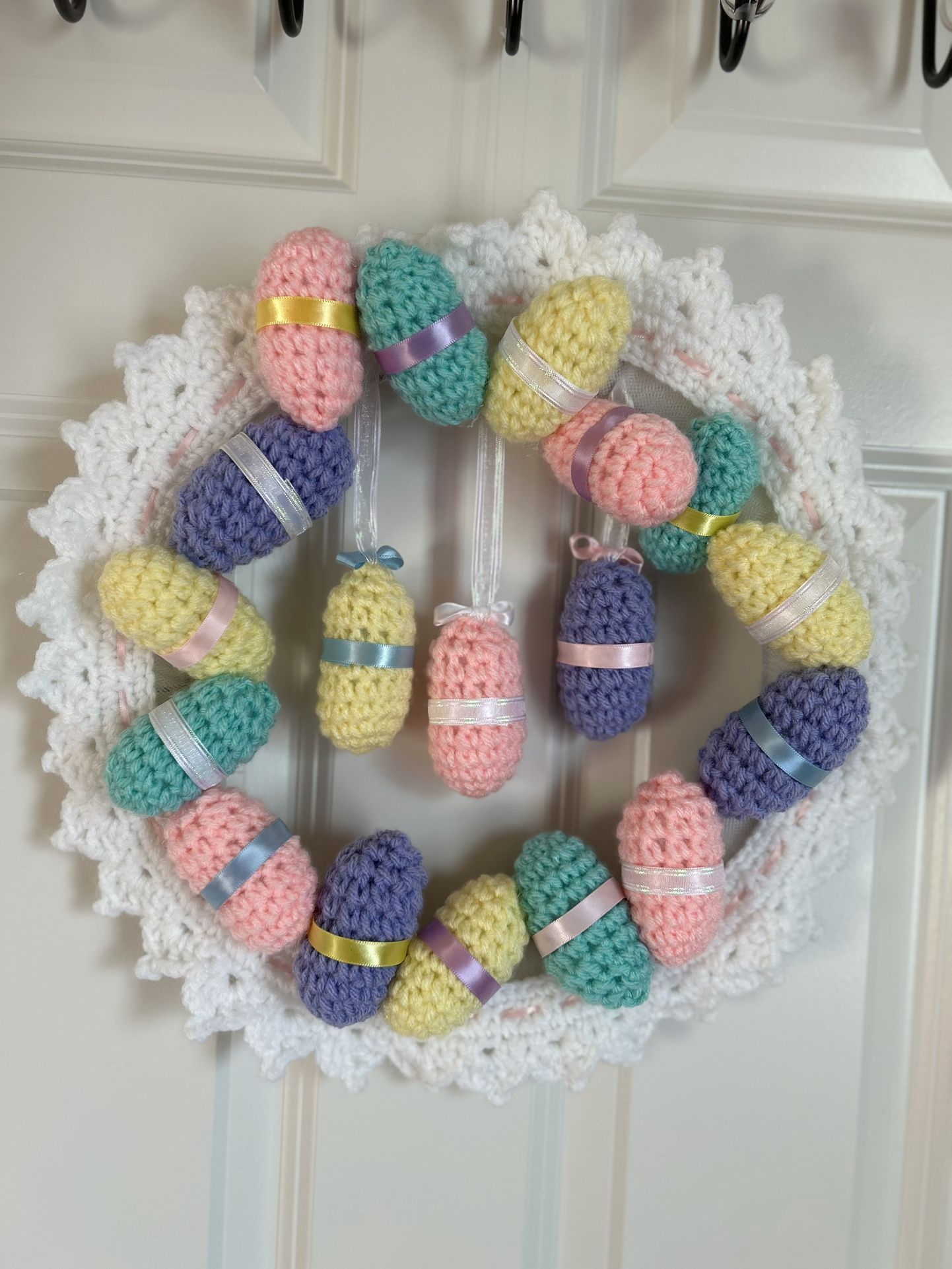 Crocheted Wreath with embellishments Pastel color This project was custom/hand made by my tween to raise money to purchase something big From pet-free and smoke-free home This is 1 of 2 projects made. Please check my other post for the other wreath