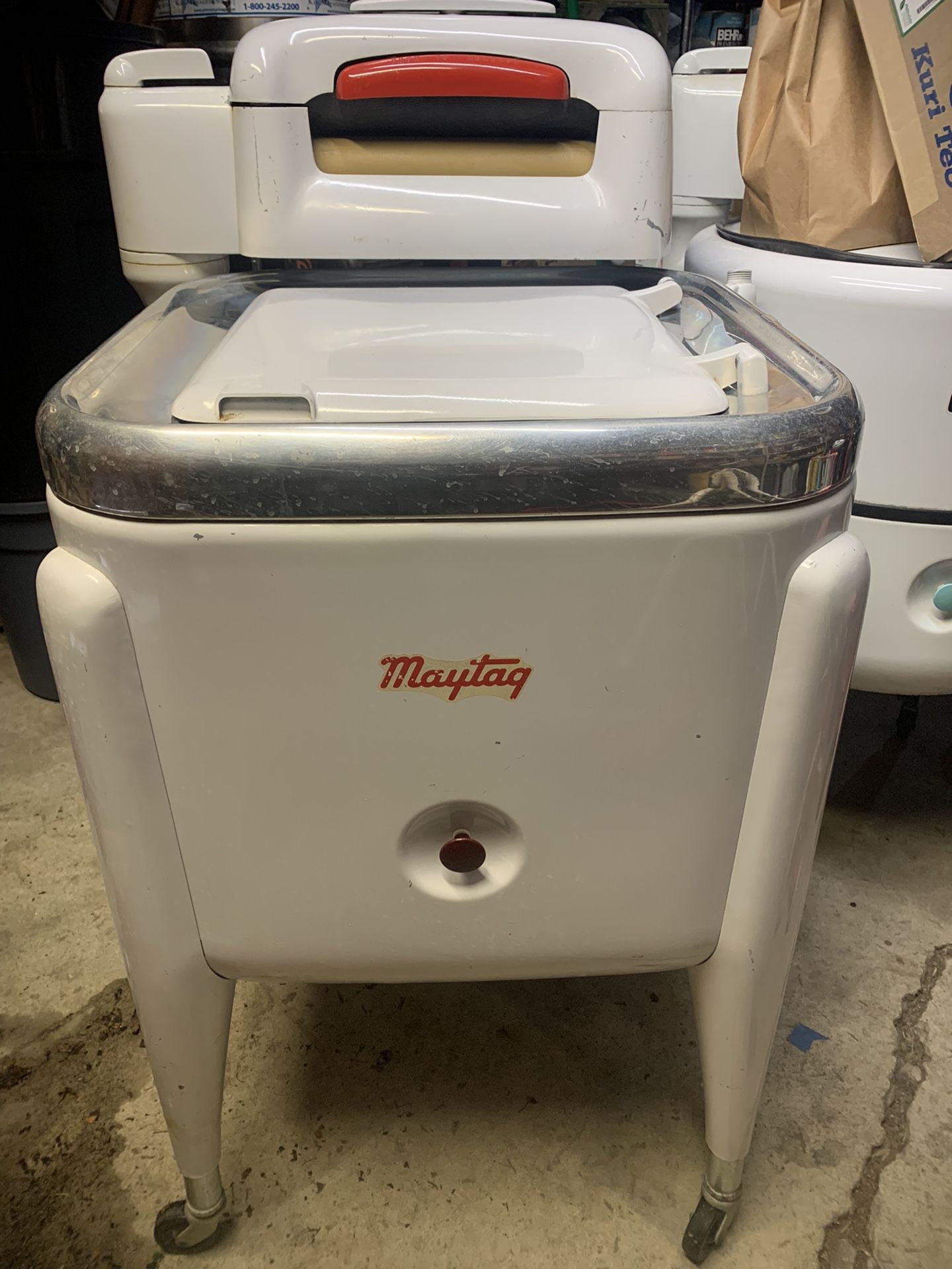 1950’s Maytag wager. From my understanding it was never hooked up. Every part to the washer is intact and original. I plugged it in and it turned on and seemed to run. Would make a good centerpiece or if u want to use it.