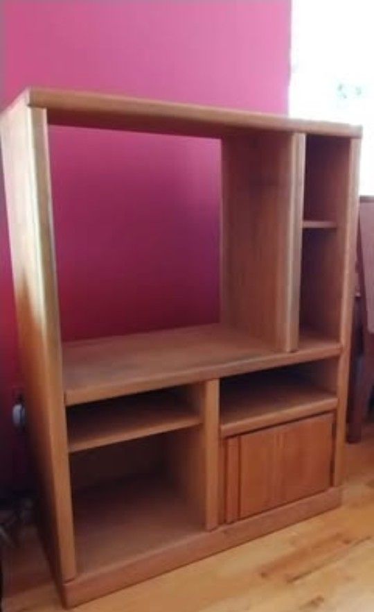 Real wood entertainment center Measures 36" wide x 17" deep x 48" tall. Please bring your own helper to move this item.
