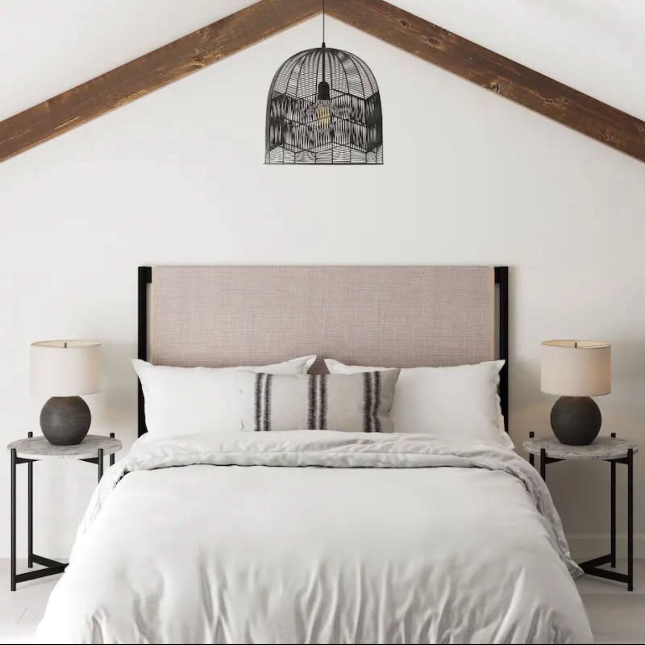 Queen Headboard with Rattan Accent, Bohemian Cane Upholstered Panel