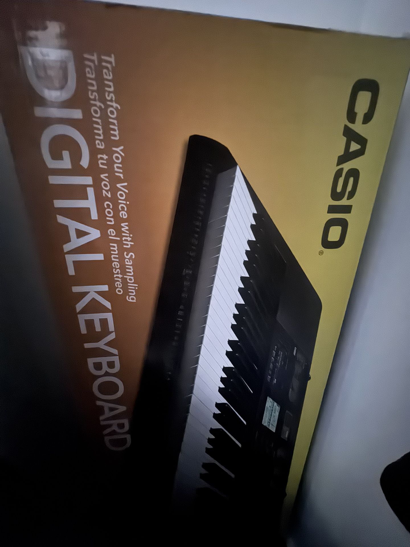 No stand. Just keyboard and power outlet. Comes in box. Works.