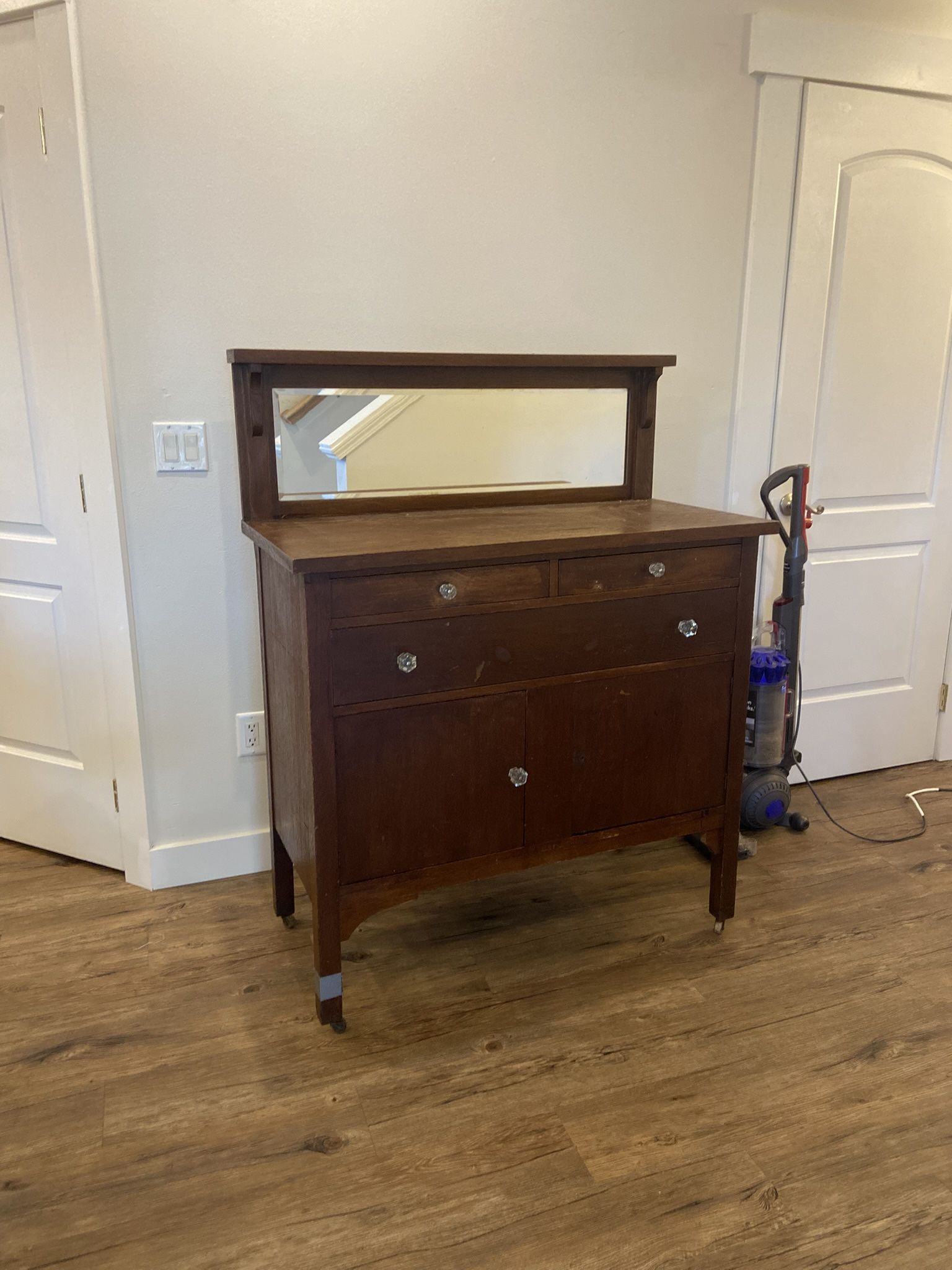 Leg is taped has a crack Second pic are for styling ideas 42”W x 20.5”D x 40”H Top mirror is removable Beautiful antique washstand / small sideboard from around 1900. Solid wood with original casters and framed mirror backsplash. Features two drawers and cabinet storage below — perfect for entryway storage, coffee bar, or cottage-style accent piece. Warm wood tone with lovely age character. Crystal knobs are later replacements. Approx size: compact dresser/washstand scale. Pickup Tacoma.