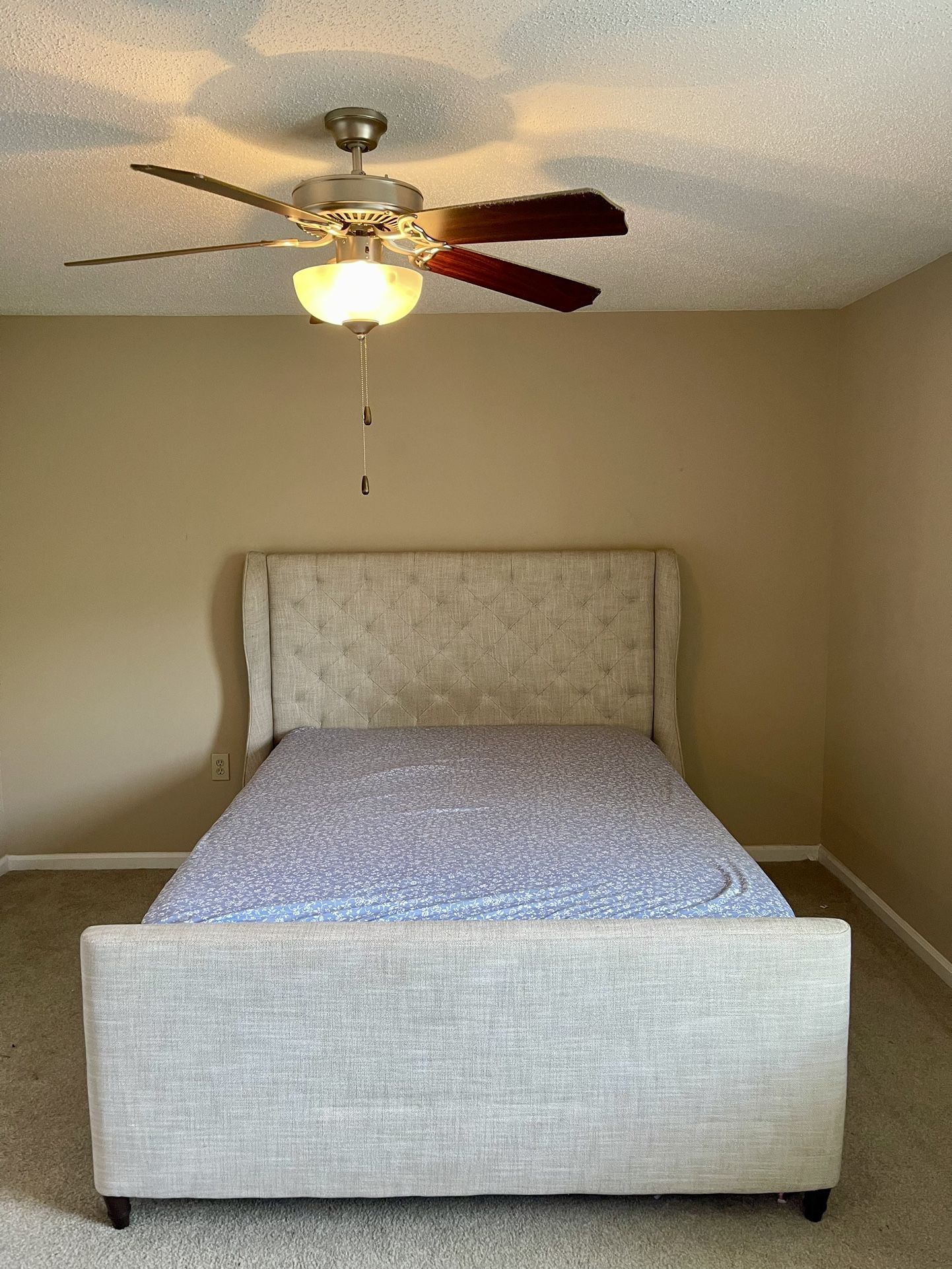 Good Condition The upholstered design features a textural beige fabric as curved wings and tufting accent the headboard. Headboard product dimensions: 12.5"L x 71.5"W x 56.5"H Footboard product dimensions: 3.5"L x 65.0"W x 28.0"H Rails product dimensions: 2.5"L x 81.0"W x 8.07"H Material: Fabric, foam, plywood, rubber wood, hardware True color: Beige