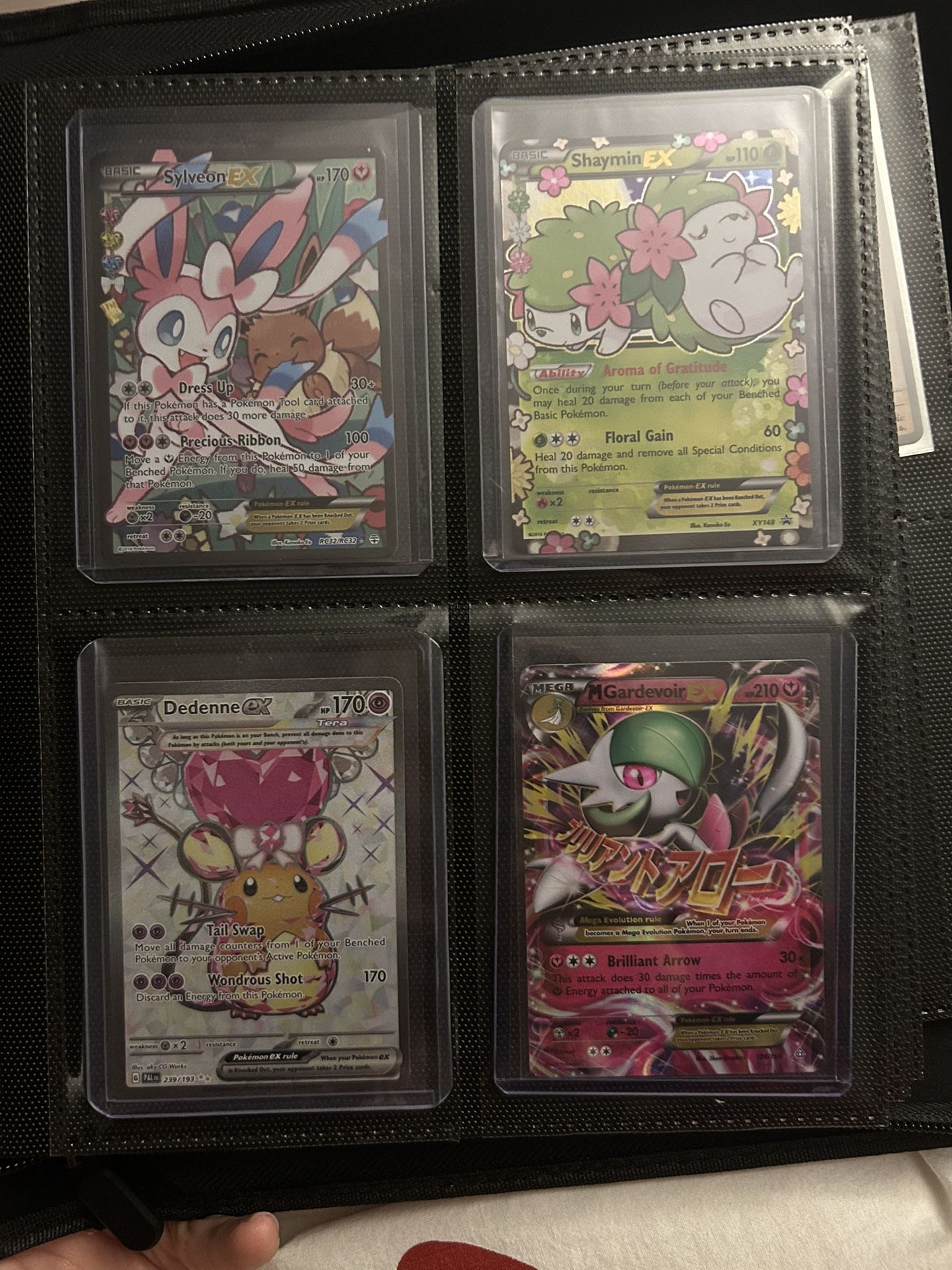 Debatable prices for some- dont be scared to ask😛 Sylveon full art- 75 Gardevoir - 10 Shaymin - 35 Rowlet & alolan exeggutor - 30 Dedenne - 6 Swabblu - 8 Ditto - 5 Screamtail - 5 Jirachi full - 35 Cleffa - 13 Minior - 8 Minccino - 12 Charmander- 7 debateable cause reallyyy damaged Manaphy - 10 Lapras - 8 Snom - 8 Duskull - 5 Bellibot - 5 Eevee Vmx - 8 Riolu - 6 Dedenne radiant - 15 Pikachu libre - 8 Yamper shining- 7