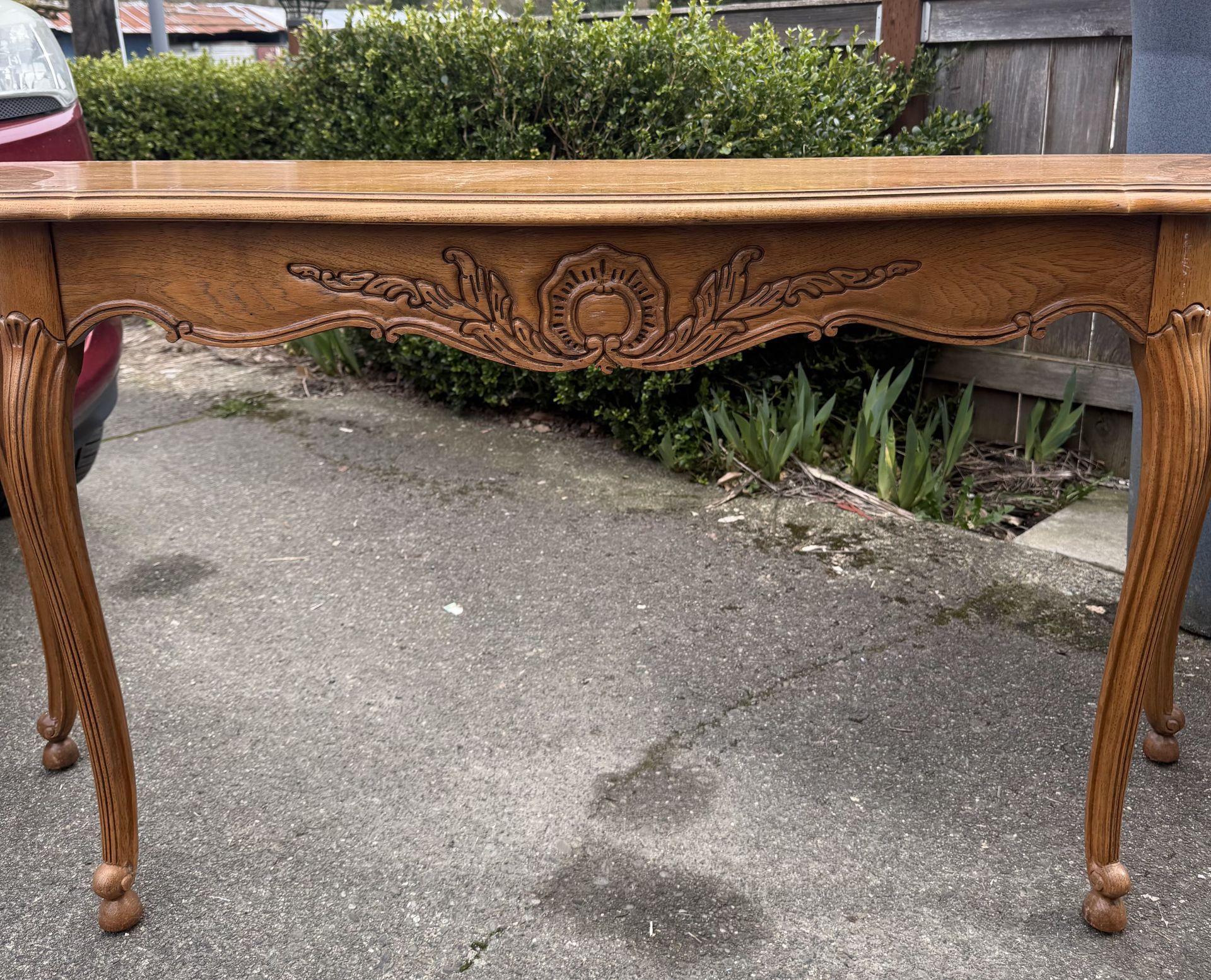 Beautiful carved-detail console table for your living room, bedroom or coffee bar. Likely vintage. Throw a table runner on it for extra elegance. Located in downtown Orting for pickup H28.5" x W55" x D16"
