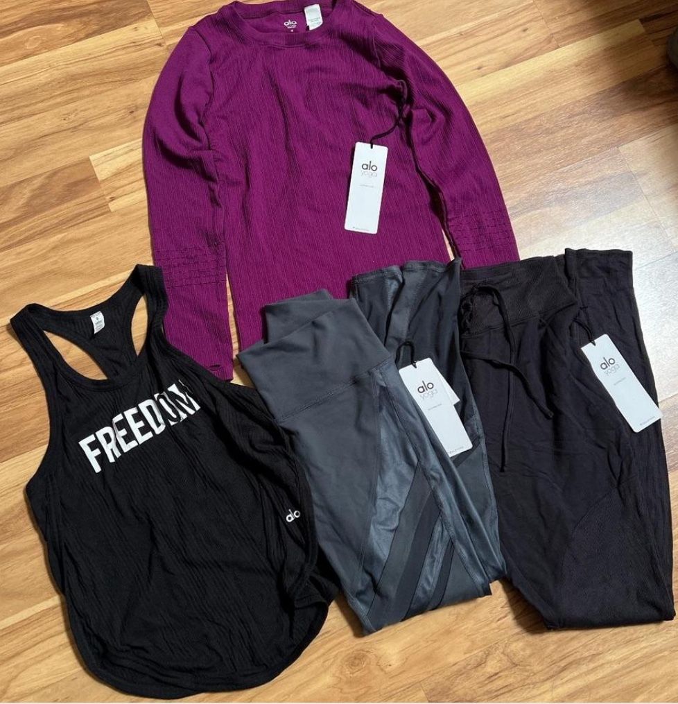 4 pieces of Alo Yoga Clothing: *Juneberry Exhale Long Sleeve Top with thumb slits - M *Anthracite High Waist Epic Legging - M *Black Lace Up Pant - M *Black Freedom Tank Top - S All brand new, 3 comes with original tag Pick up in Fullerton, CA