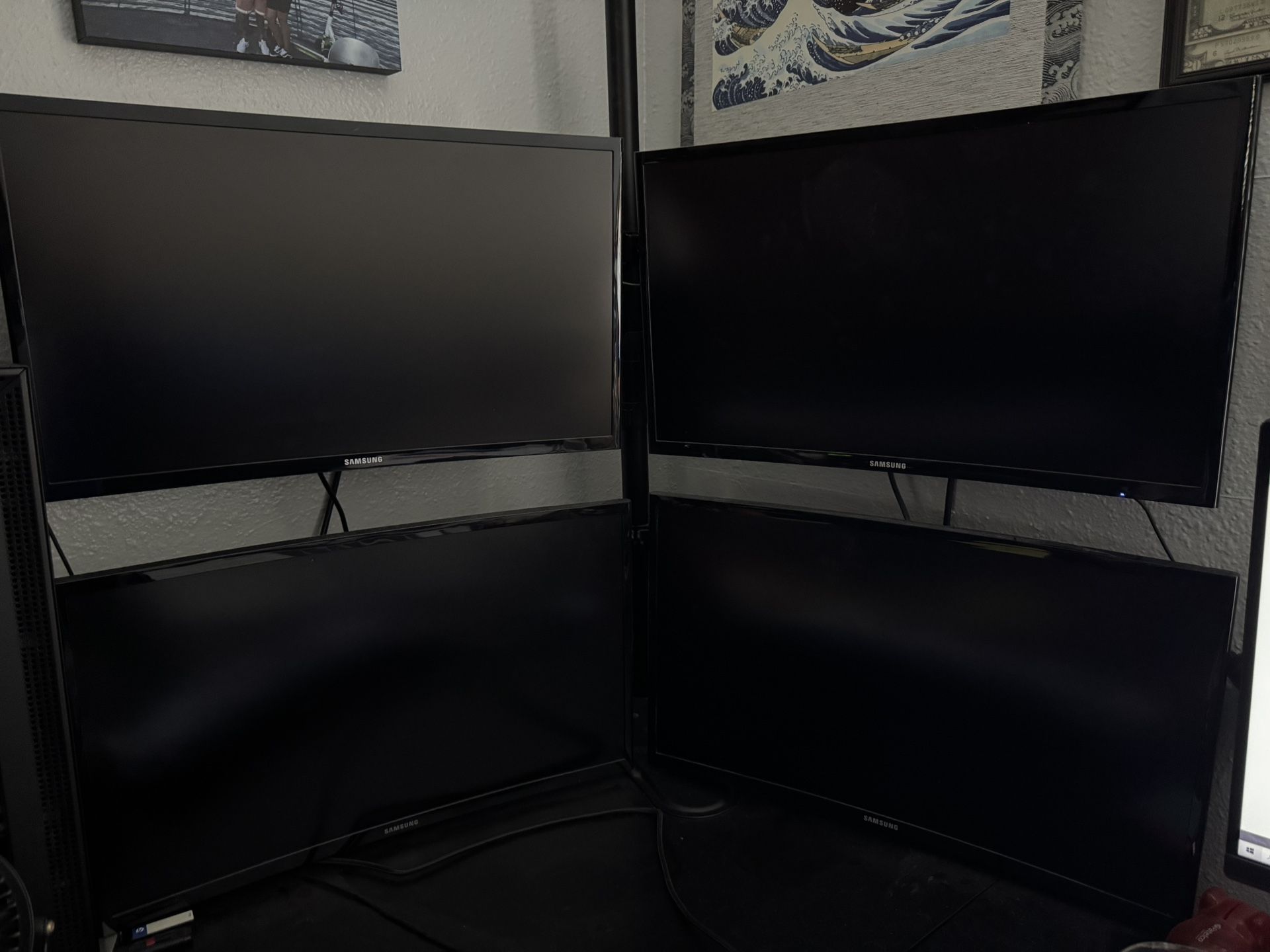 4 Samsung curved monitors Stand included (adjustable, holds 4 screens) Left my last job and don’t have a need for it anymore! Would be ideal if you’re into stocks, automation software, streaming gaming, graphic design, etc.! Stand can be adjusted to have all 4 screens be touching, but out of personal preference I liked the space between them. Will include all power supplies and HDMI cords. $275 Picked up from 95826 Thanks for looking!
