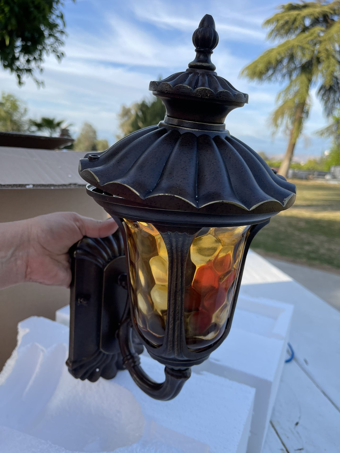 This outdoor wall light is a beautiful choice for your porch or patio space. It comes in a warm bronze finish and features champagne hammered glass for an elegant antique look. A scrolling upbridge arm adds a great decorative touch. It’s completely new and didn’t need it anymore I got it for 100 and I’m asking for $25.