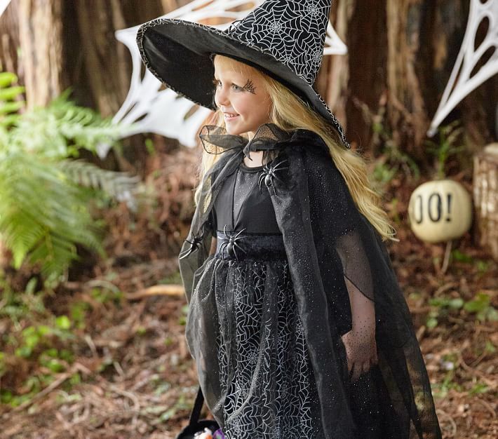 Pottery Barn costume Size 3T Dress and hat glow in the dark. Glow-in-the-dark material needs to “charge” under bright light for approximately half an hour to glow properly. Glow lasts for approximately three to four hours. The glow effect will become weaker over time because of the constant rubbing. Costume is yarn-dyed – fibers are treated individually with environmentally safe dyes before weaving to offer vibrant, lasting colors. Undergarments not included. Spot clean. Imported. THIS SET INCLUDES 3-piece design includes 1 dress, 1 cape and 1 witches' hat.