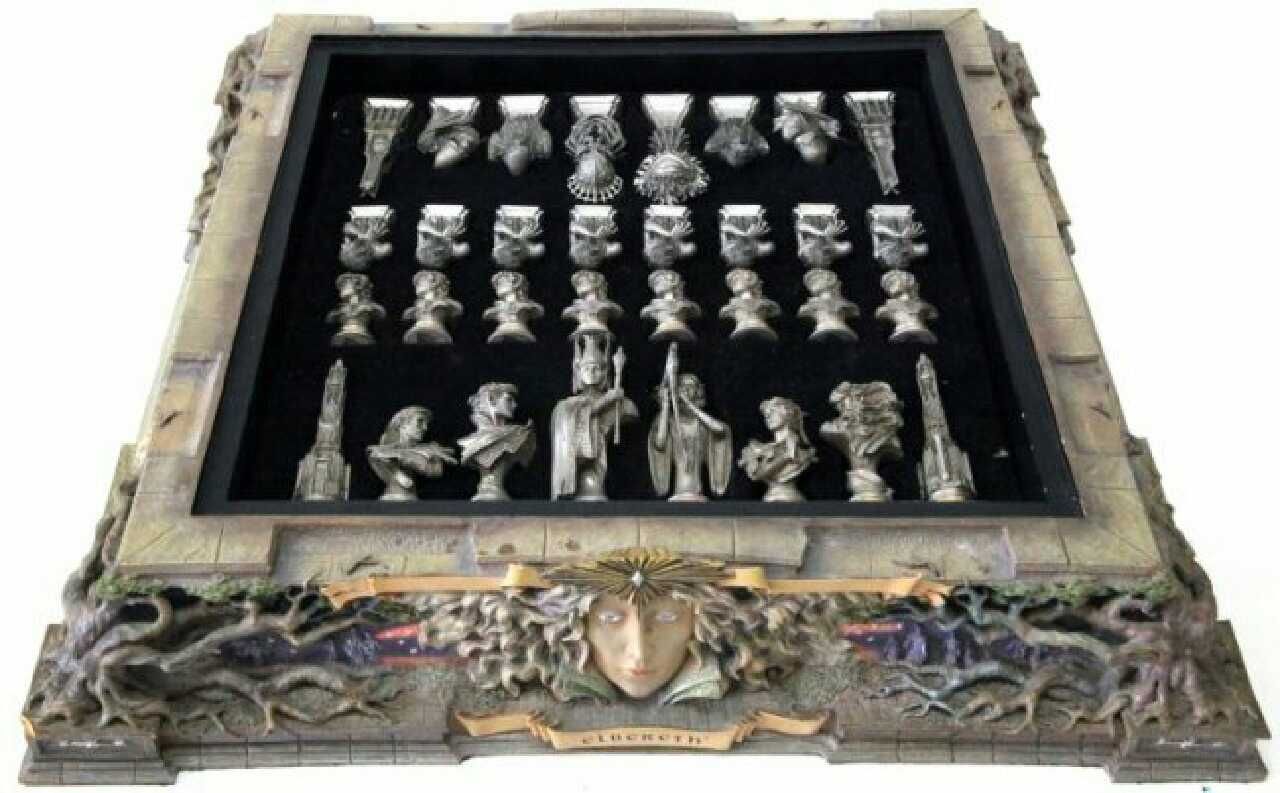 Official Lord Of The Rings Chess set designed by Stephen Hickman for the Franklin Mint. Original MSRP: $1200.00 Each of the 32 pieces sculptured in pewter for exquisite detail. Hand painted and brilliantly accented in 24 karat gold and sterling silver. Complete with custom designed playing board with a hidden storage compartment that has fitted housing to hold and protect all the pieces. Board: 3.25" high x 20" square Piece Sizes: 1.75" (pawns) to 4" (King) Board lifts to store the pieces Kings: Aragorn (Good) & Sauron (Evil) Queens: Galadriel (Good) & Shelob (Evil) Bishops: Gandalf, Glorfindel (Good) & Saruman, Wormtongue (Evil) Knights: Eomer, Eowyn (Good) & Lord of the Nazgul, Ringwraith (Evil) Rooks: Minas Tirith (Good) & Minas Morgul (Evil) Pawns: Frodo (Good) & Gollum (Evil) Excellent condition except for small hole in storage compartment felt. Set was never displayed or played on. Comes with original box.