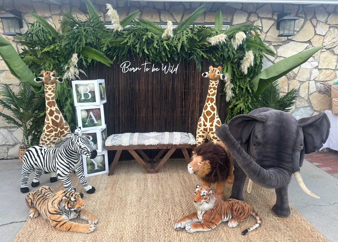 Stuffed animals for sale. Looking to sell as set but can be sold individually. 1 giraffes available. 1 tiger 1 cheetah and 1lion $50 each or all 4 for $175 firm Bench available for $100 Born to be wild letters also available $35
