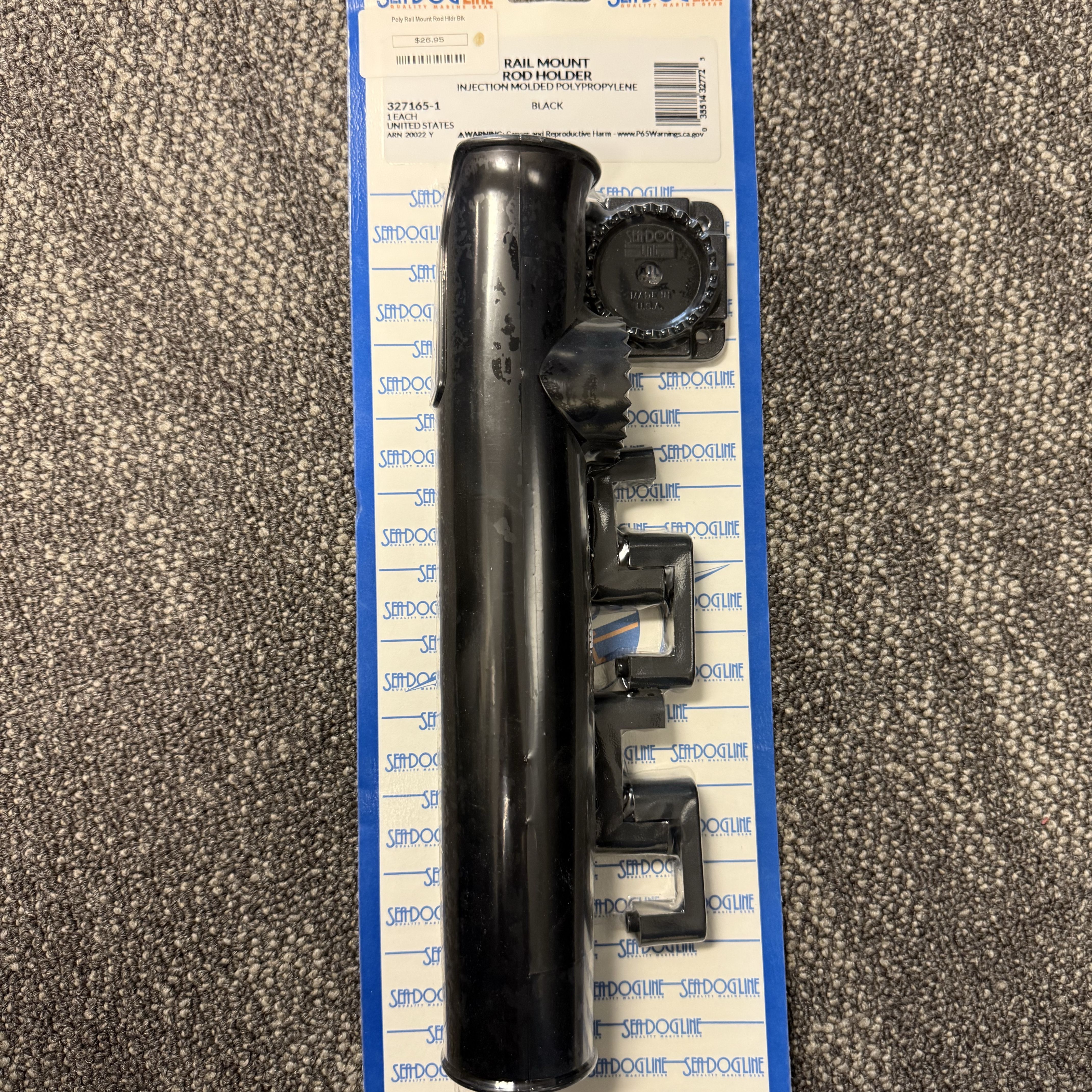 Black plastic rod holder with multiple mounting positions and adjustment mechanism. Durable construction for secure fishing rod storage. ($45 Each - 4 Available) CLEARANCE ALL SALES FINAL