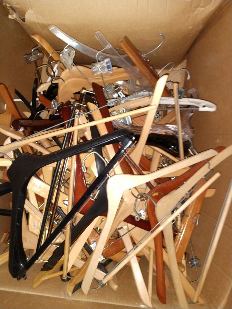 Cardboard box full of wooden clothes hangers over 25. Couple different kinds.came from a family member so are in fairly good shape and excellent shape