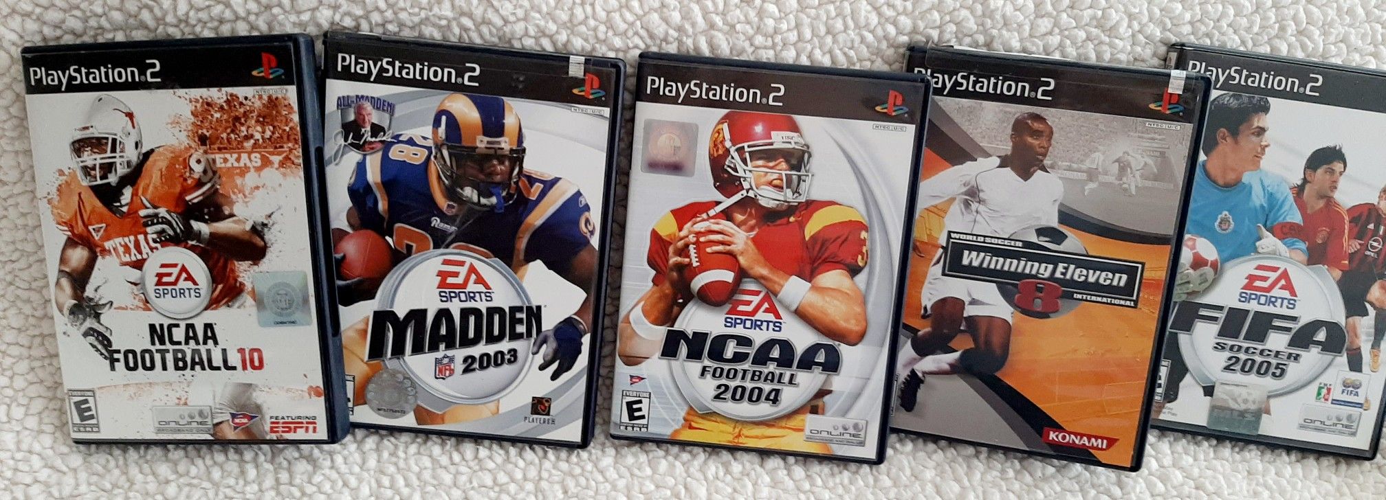 EA Sports NCAA Football 2004 Online, Madden NFL 2003, FIFA Soccer 2005 Online, World Soccer Winning Eleven 8 International Konami, NCAA Football 10 Online Featuring ESPN. Good condition!