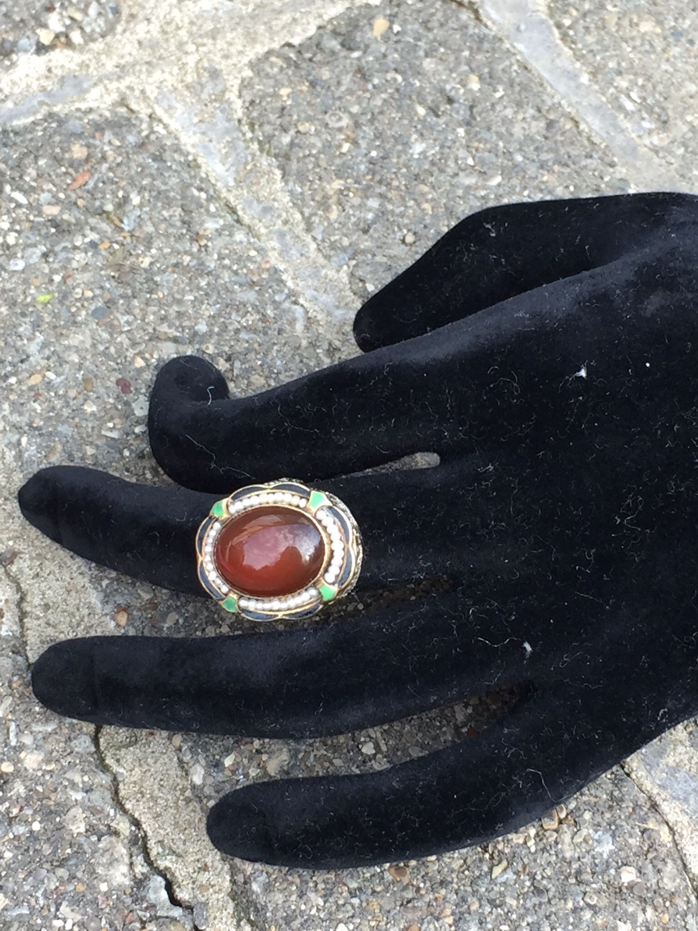 Up for sale is a beautiful bezeled oval cabochon Orange Moonstone Edwardian Filigree Ring Set in 14KT yellow gold. This amazing piece is decorated with white seed pearls, 4 green stones on 4 corners, black wavy stones bordering the focal point. The Filigree design is stunning. Stamped & tested. Size: 5.75 Weight: 5.20g Stamped: 14K Center Stone: 15.07mm h x 11.78mm w Top: 22.37mm h x 19.10mm w x 8.84mm thick Band: 2.30mm w x .85mm thick Please do not hesitate to make a reasonable offer.