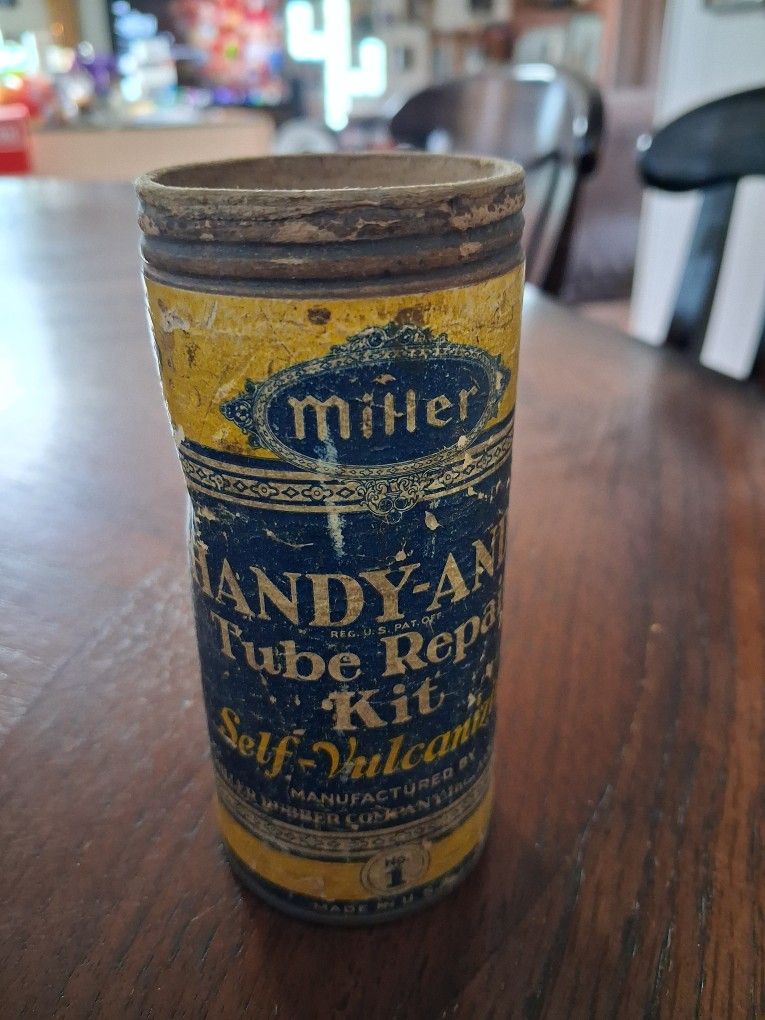 vintage Miller Handy-Andy tube repair kit can, likely from the 1930s.