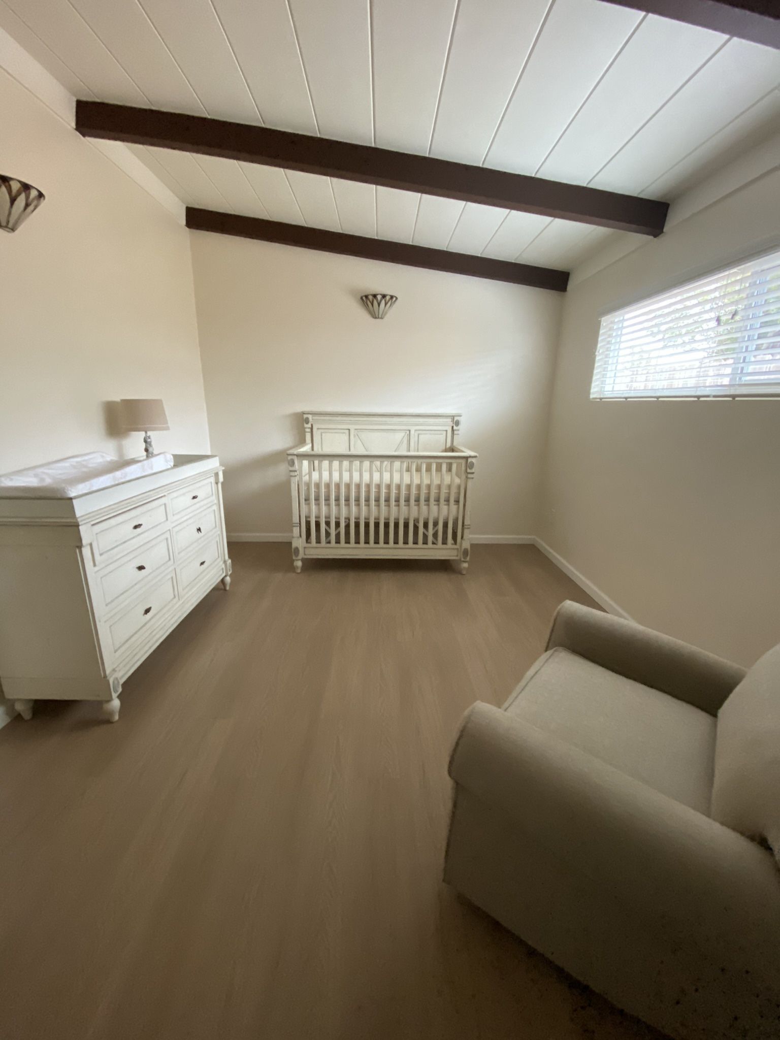 Restoration hardware nursery set. Quality set. All real wood. Includes dresser with changing table top, crib (disassembled - will need to reassemble-- only requires 4 screws), spring to place mattress on, does NOT include mattress. Used with my two kids over the last 5 years. ORIGINALLY $8000. Selling for $1000 OBO Has a stain on stop of dresser from an accident where something burnt the top of the dresser. Fully functional and covered by changing top anyway.