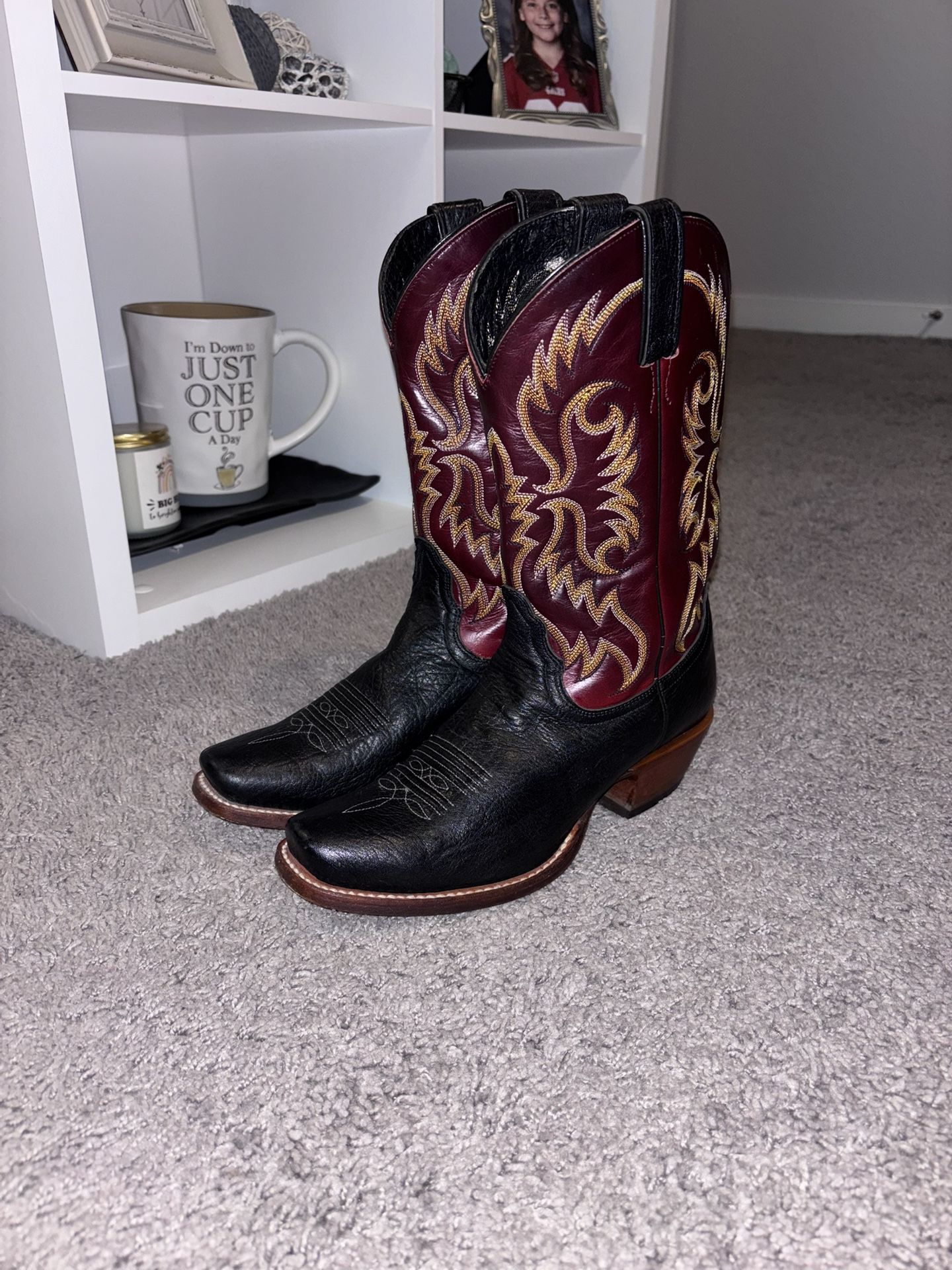 Burnished black & burgundy leather highlighted with yellow/orangish shaft stitching. Handcrafted leather upper, lining, heel, & sole. Cushioned, walking comfort insole. Modified square toe profile. Smooth leather sole with rubber grip heel surface. This short, sweet Nocona boot is a versatile addition to your western wardrobe. Used but lightly. Women’s size 7.5B Willing to negotiate