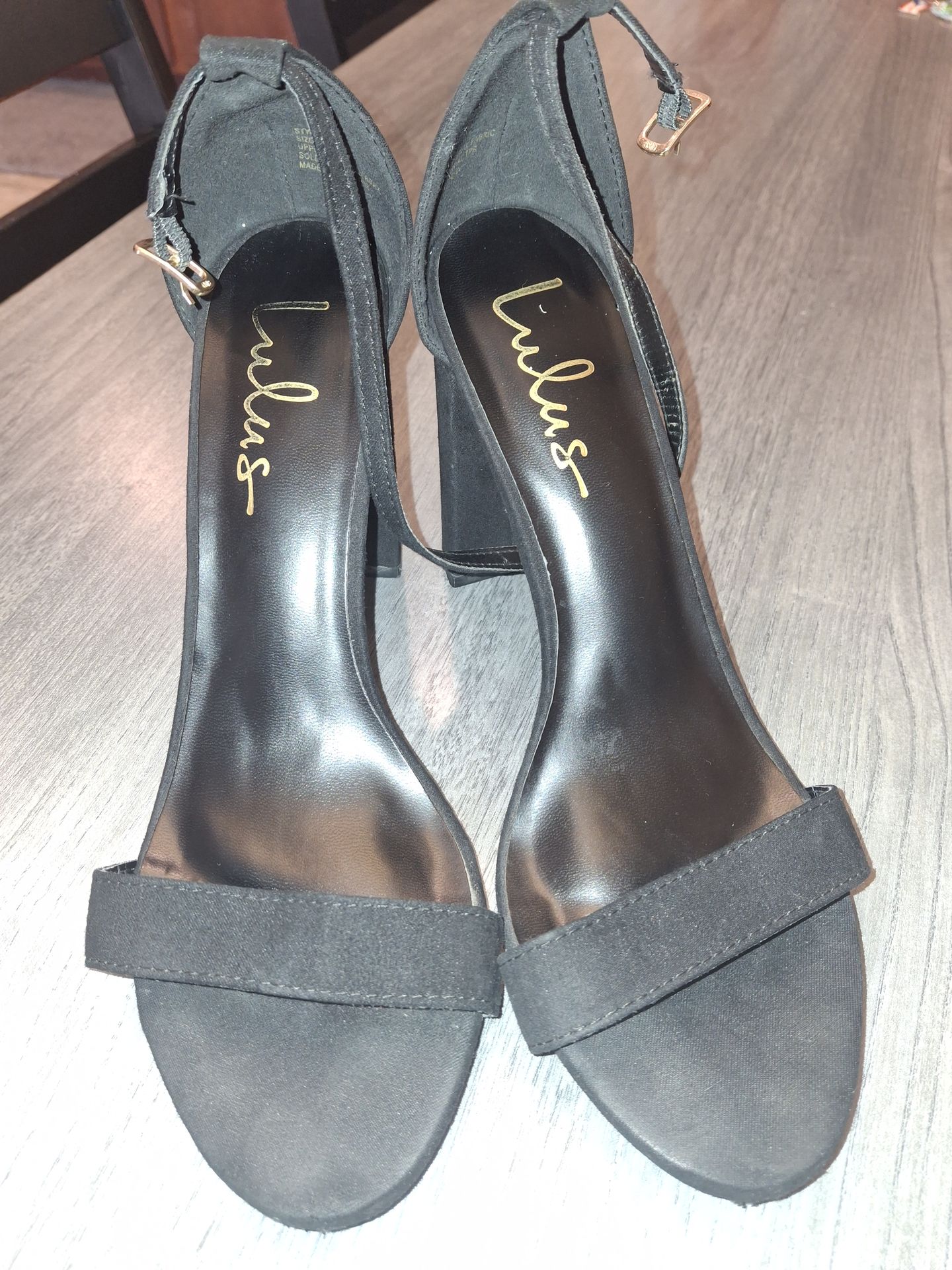 Lulus Taylor Black Suede Ankle Strap Heels. These elegant sandals feature a faux suede upper with a single slender toe strap and a matching adjustable ankle strap with a gold buckle. They are designed with a block heel that typically measures approximately 4 inches in height. Product Details Brand: Lulus Style Name: Taylor Material: Faux suede upper, man-made materials Features: Single toe strap, adjustable ankle strap, block heel Heel Height: Approximately 4 inches Purchase Options These heels are available through various resale marketplaces, with prices generally ranging from $14 to $55 depending on the condition and size.