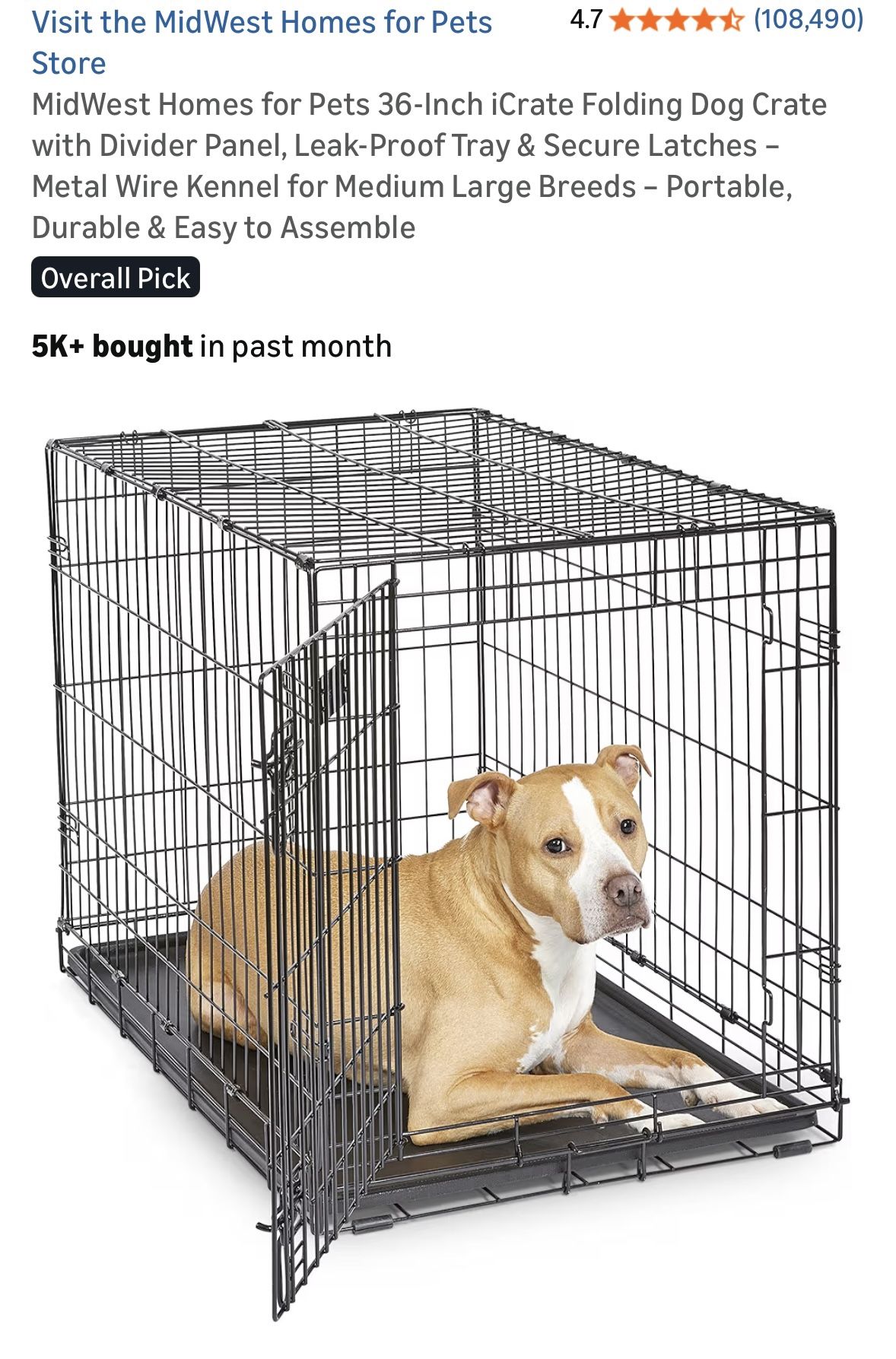 MidWest Homes for Pets 36-Inch iCrate Folding Dog Crate with Divider Panel, Leak-Proof Tray & Secure Latches – Metal Wire Kennel for Medium Large Breeds