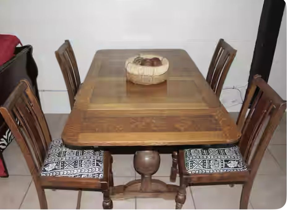 The Antique English Draw Leaf Table and chairs set seats 6 people and can be converted to a smaller size. Made of oak in a rectangular shape, this dining set from 1929 features an extending and space-saving design. A brown finish with fabric upholstery. Chair legs need tightened and seat padding reinforced. With its historical charm, this set is perfect for those looking for a unique and functional dining experience.