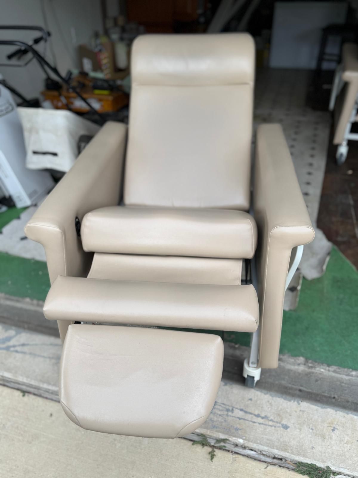 🪑 694N Swingaway Arm CareCliner – Key Features • Weight Capacity: 300 lbs • Frame: Durable all-steel construction with powder coat finish • Mobility: Casters and caregiver push handle for easy transport • Swing-Away Arms: Yes – allows for easy cleaning and lateral patient transfers • Side Tray/Table: • Foldaway side table with reinforced bracket • Blow-molded fold-down trays with cup recess on both sides • Reclining Back: Infinitely adjustable for user comfort • Leg Rest: • Self-storing for shorter patients • Automatically extends when reclining • Wall-Hugger Mechanism: Yes – designed for tight-space operation • Upholstery: Smooth, seamless, and fluid-resistant for easy maintenance • Headrest & Comfort: • Built-in ergonomic headrest • Elastic seat base and back band for added support • Reclining Positions: 3 different user-adjustable positions • Trendelenburg Feature: Yes – release handle accessible from both side.