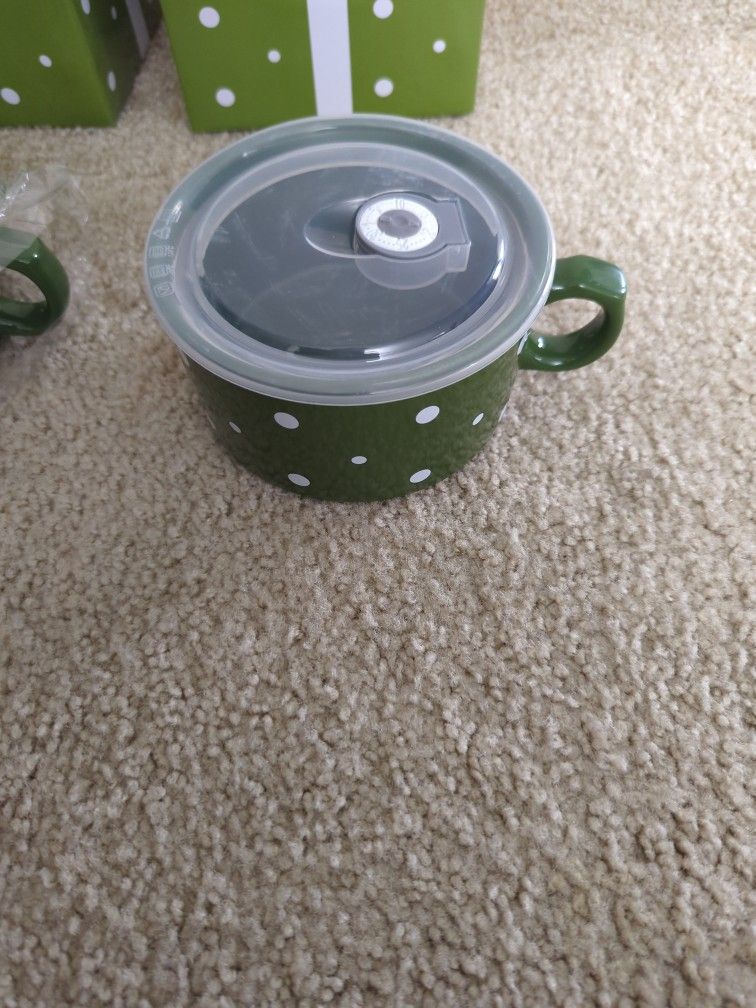 Two of them 22 oz green and white polka dot mug with lid Temptations by Tara collection Oven, diswasher and microwave safe Gift boxed Opened to take pictures Not used